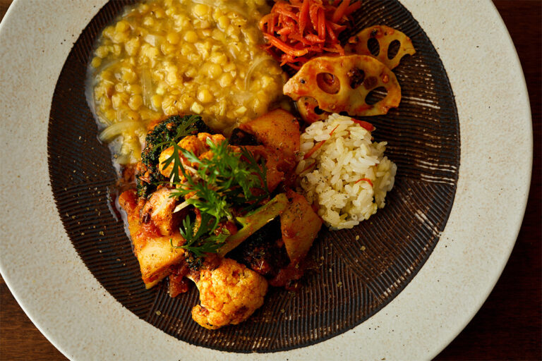 青菜のインド風お浸し、アサリとメースの佃煮など、和テイストとスパイスが融合した副菜が味わい深い。別添えのカレーは、「鯖とみょうがの出汁カレー」も選べる