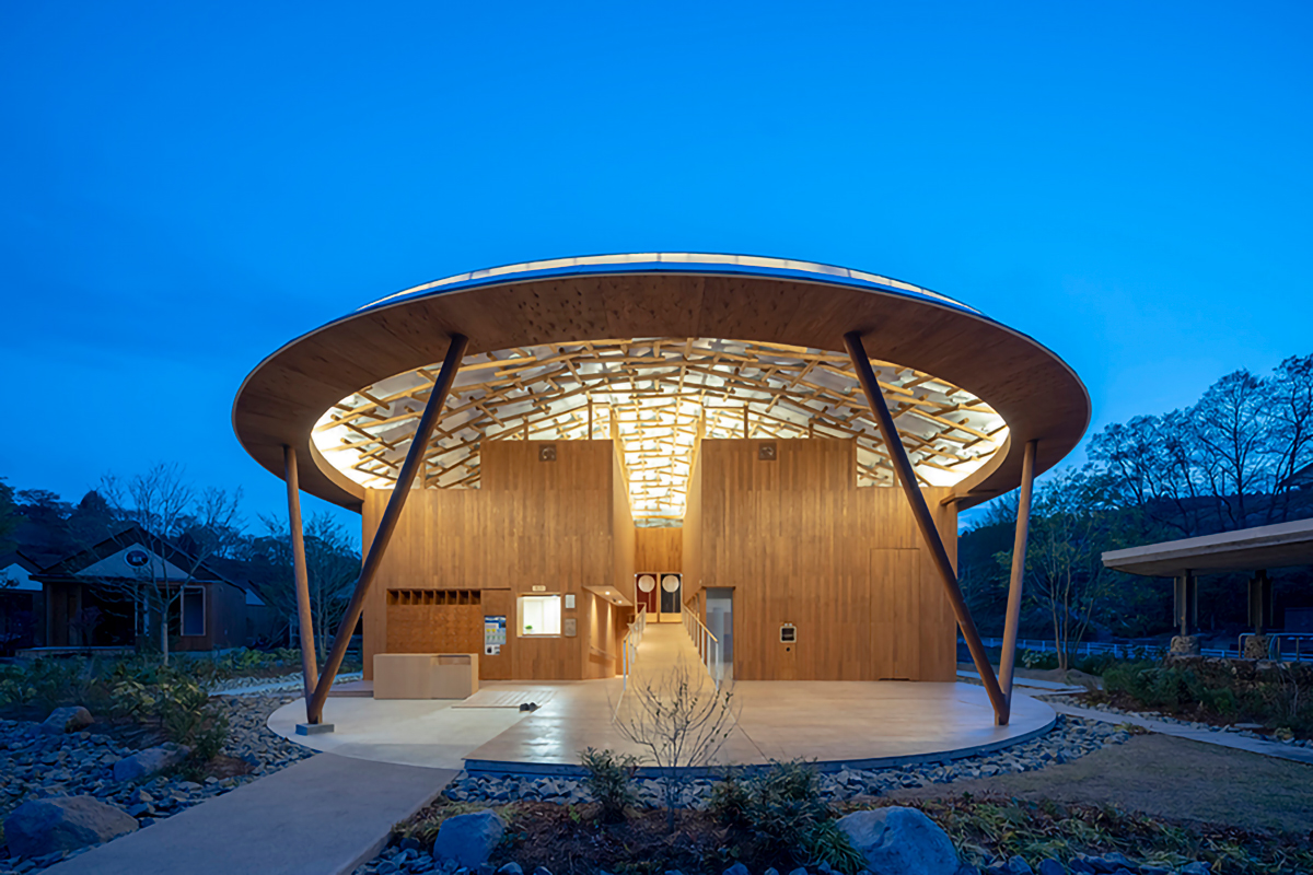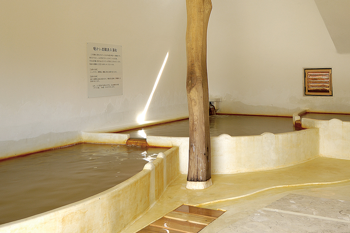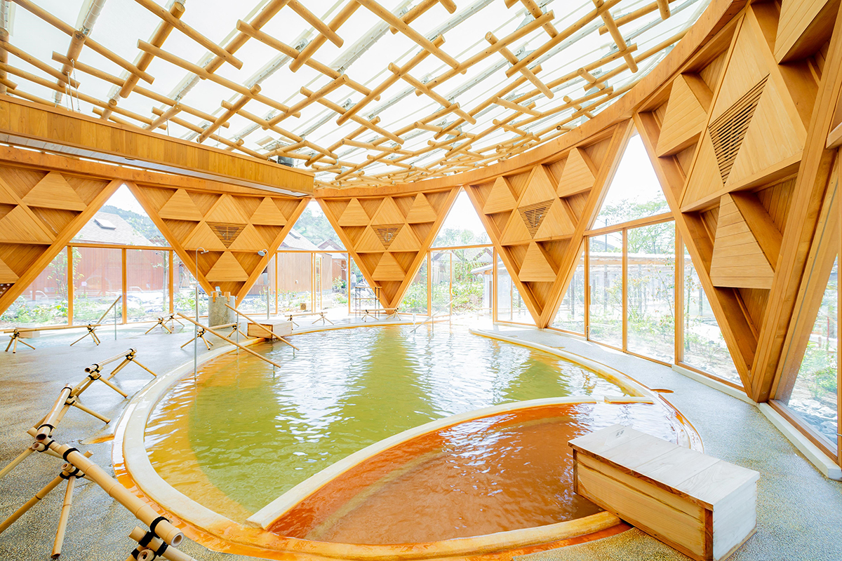 ドイツの温浴保養地「クアオルト」を原型とした温泉療養複合施設。世界でも類を見ない木や再生紙を使った独自の木造建築は、建築家・坂茂氏によるもの。日本唯一の重炭酸泉によって自然治癒力を引き出す現代の湯治場であり、温泉棟にはランドスケープをゆったりと歩く歩行湯や、長時間過ごしても身体への負担が少ない寝湯などがある。