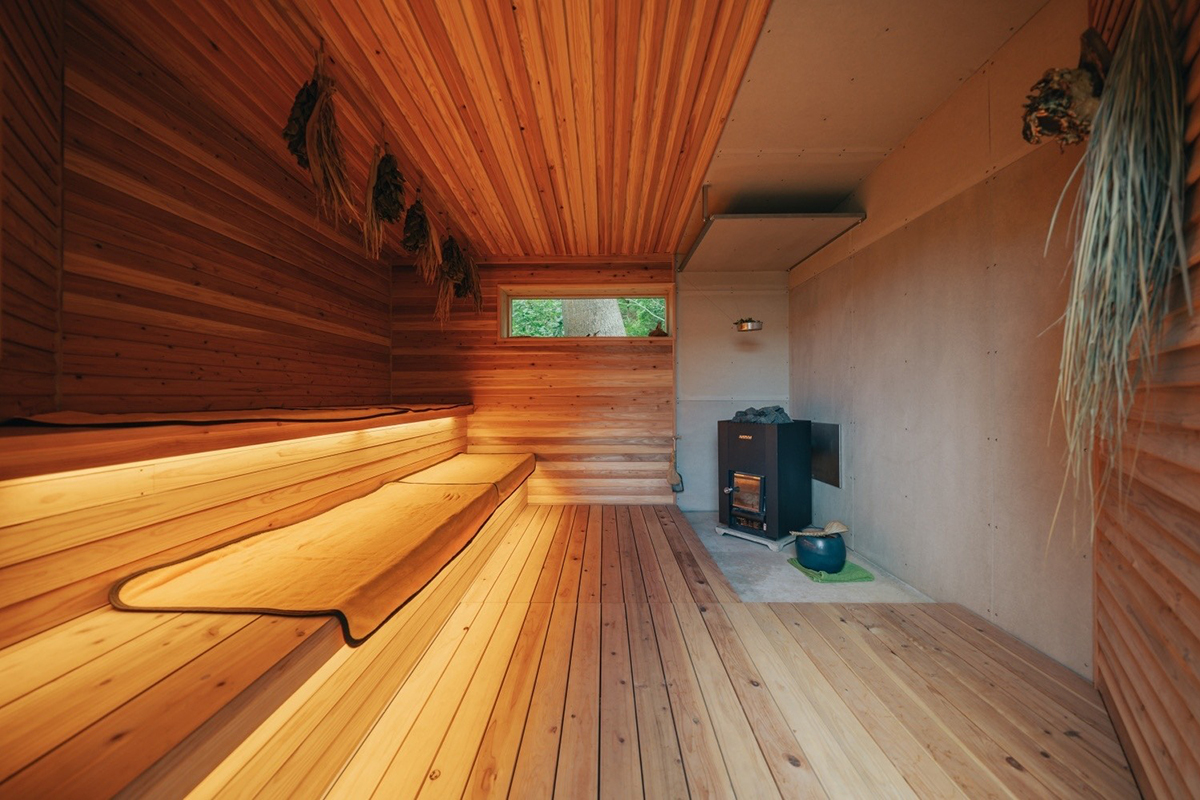 廃校の跡地活用事業としてスタートした低温のハーバルサウナ。やんばる地区に自生する月桃・琉球シナモンといった植物を用いてアロマオイルや芳香蒸留水を精製しており、沖縄らしいロウリュや季節のウィスクを提供。窓から見える鮮やかな景色を主役にした五右衛門風呂の水風呂や、鳥がさえずる森での外気浴が新たなととのいをもたらす。