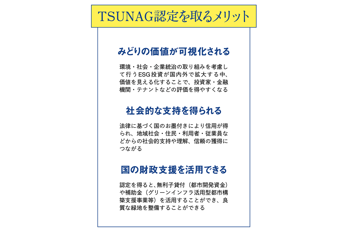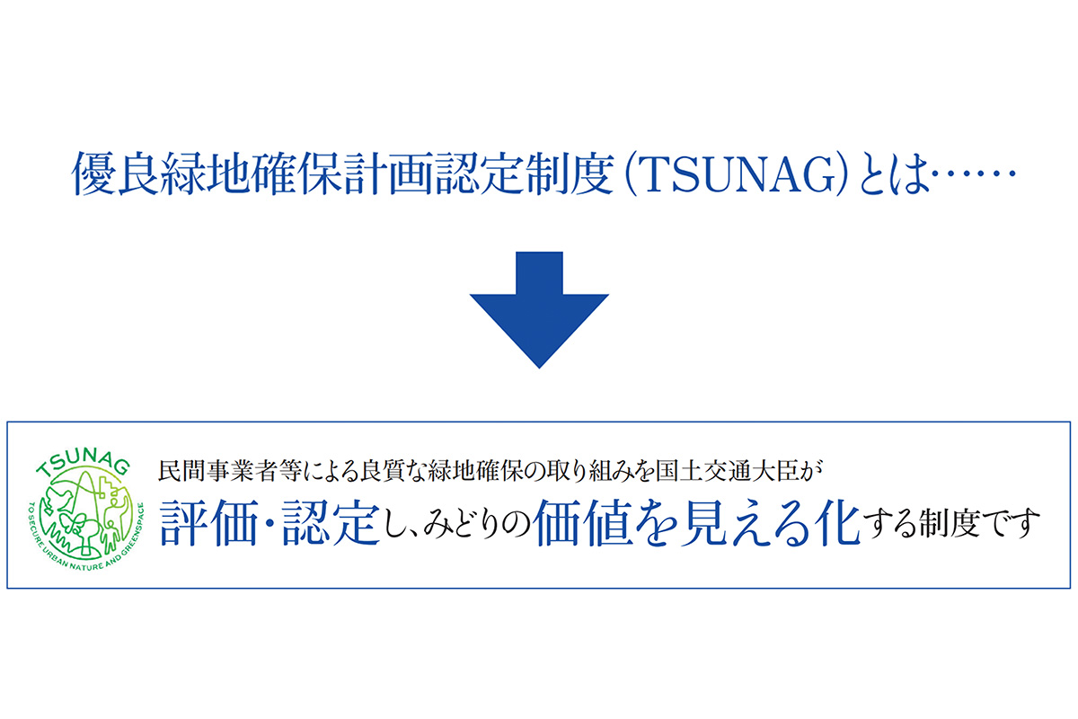 「環境や健康への効果など、みどりのもつ役割の大きさが世界的に再認識されているところですが、日本の都市の緑地は減少傾向にあります。そこには、みどりの価値はわかりづらいため、その価値が市場経済の中では評価されず、その確保が限定的になっているという背景があります。TSUNAGは、良質な緑地確保の取り組みの価値を国として評価・認定し、“見える化”することで、市場の原理で、緑地の確保が進むことを目指しています」