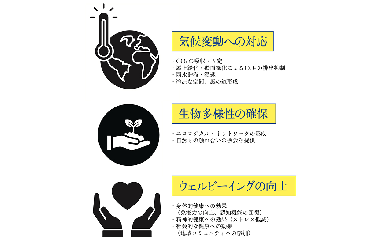 緑地や河川、農地などの自然がもつ多様な機能(CO₂の吸収、生物の生息・生育の場の提供、雨水貯留・浸透による防災・減災、景観形成、心身のリラックスなど)を、社会資本整備や土地利用といったインフラのハード・ソフト両面に活用するという考え方。都市や環境のさまざまな課題を解決し、持続可能で魅力ある国土や地域の実現を目指す。