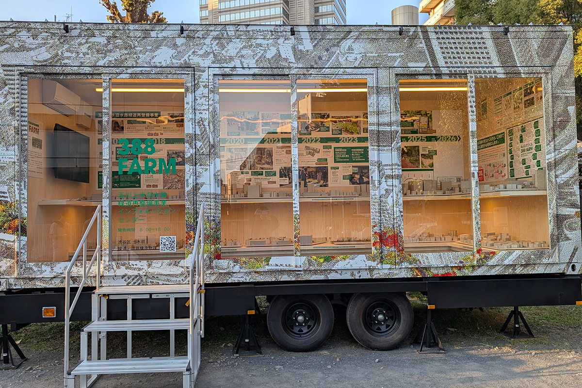 代々木緑道内に情報発信施設を設置。パネルや模型の展示、動画放映などを通して、これまでの経緯や再整備のコンセプト、ワークショップの記録などを紹介している