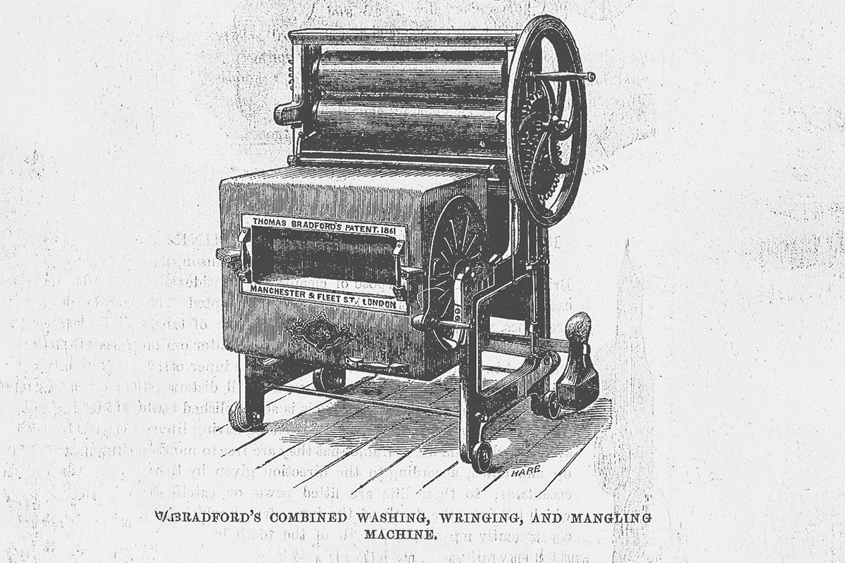 日本の使節団も訪れた第2回ロンドン万博。17世紀から開発されていた手動の洗濯機も出品され、イギリスのT・ブラッドフォード社が出品した木製洗濯機がメダルを受賞した。下の箱に衣類を入れハンドルを回して洗濯し、上のローラー状のプレス機で脱水するという仕組み。