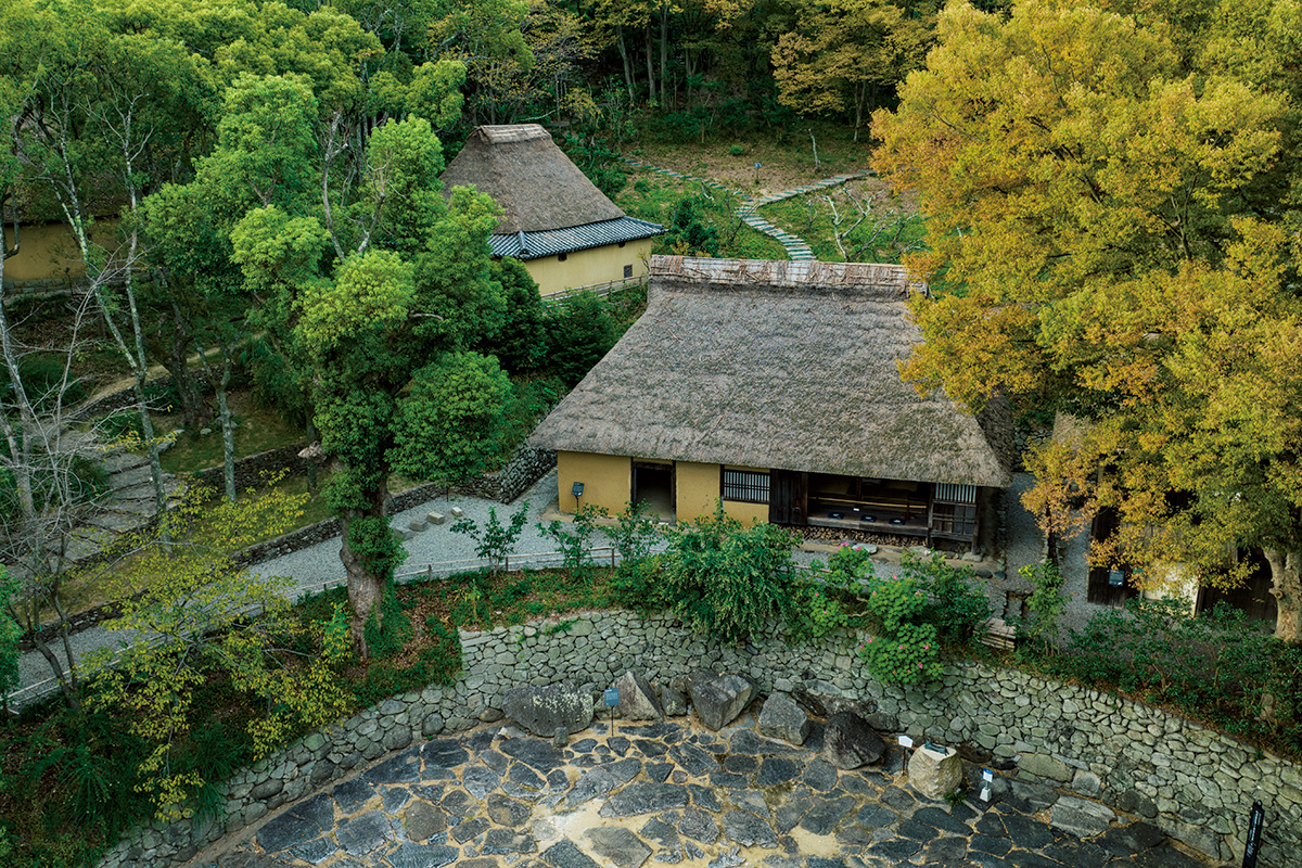 急ぎ足でめぐったとしても約1時間半はかかる、起伏に富んだ広大な敷地。爽やかな緑の香りと鳥のさえずりに包まれながら、石の道「流れ坂」を上っていくと間もなく、立派な佇まいの石灯籠や土蔵が現れる。さらに奥へと進んでいくと石畳の広場の向こうに、美しい茅葺きの家々が見えてくる。