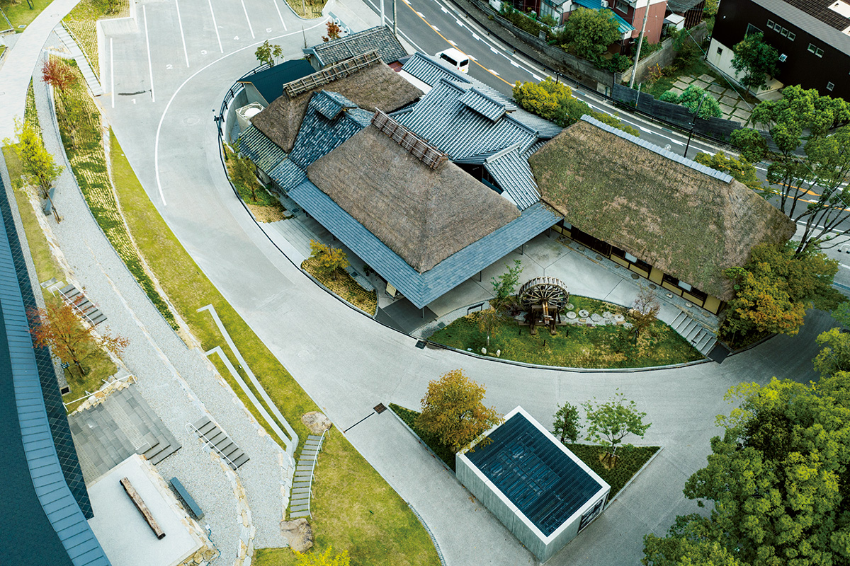 2022年にリニューアルした四国村ミウゼアム。古民家移築1号のうどん店「わら家」は、以前の塀や駐車場が取り払われ、ゆるやかなスロープと緑地帯で新エントランス棟「おやねさん」とつながり一体に