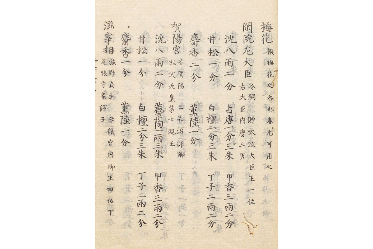 平安末期に編纂された薫物の研究書。実在した有名人たちの実際の処方記録であり、調合方法などを詳細にまとめている。六種の薫物も記録され、つくり手ごとに調合する材料や分量に違いがあることが見て取れる