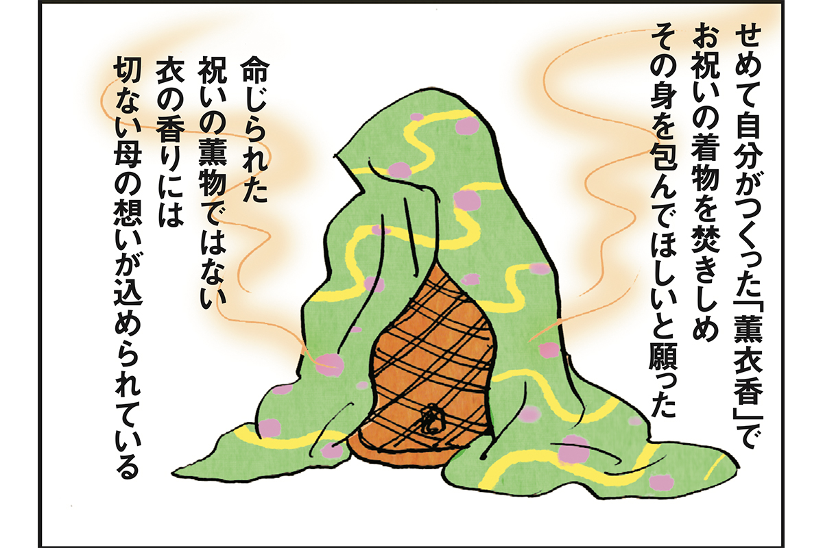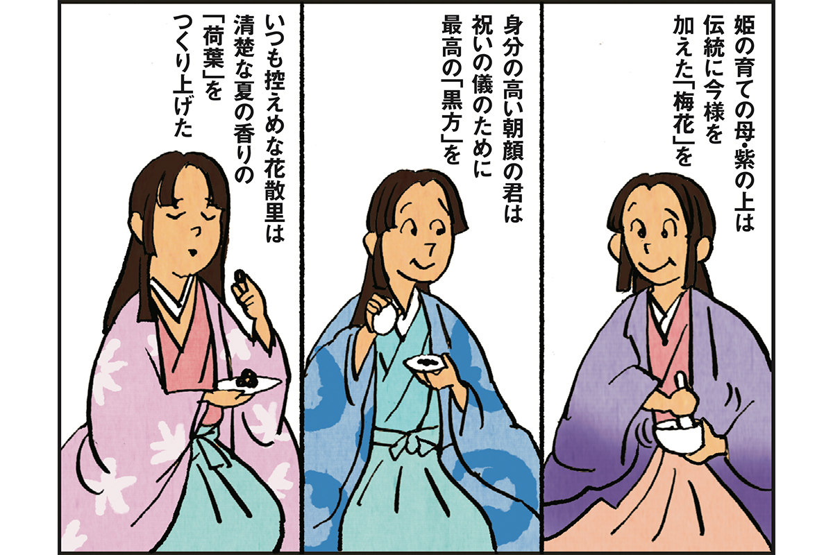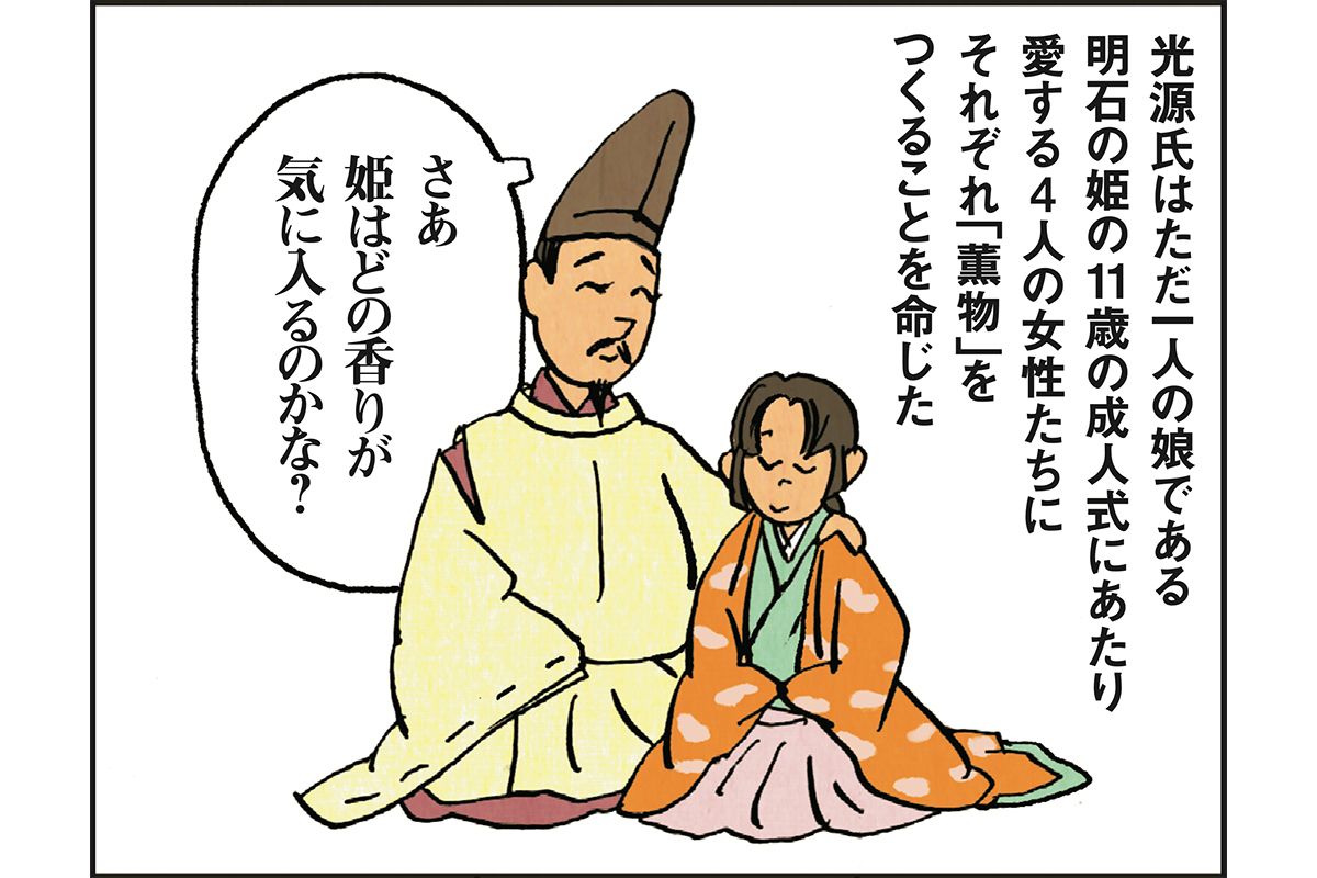 また、薫物がドラマチックに描かれるのが三十二帖「梅枝」だ。光源氏は、愛娘・明石の姫の成人祝いに、紫の上、朝顔の君、花散る里、明石の上の4人に薫物をつくらせる。光源氏は完成した薫物で薫物合わせを行うのだが、薫物は4人の女君たちの性格や心情、願望などを見事に表わしているのが印象的だ。特に産みの母・明石の上が手掛けた薫衣香には、身分違いのために自身では育てられなかった成人した娘をせめて香りで抱き締めたいとの思う母の切ない愛が読み手に伝わってくる。