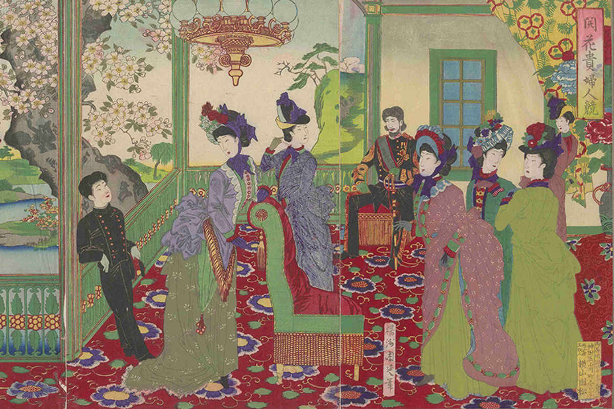 伯爵夫人や侯爵夫人となった公家の娘や大名家の奥方は、コルセットを締めてドレスをまとって西洋の客人を歓待する夜会へ。夫人たちが絹着物から仕立てたバッスル・ドレスからは雅な伽羅の香りが、また西洋の婦人からは官能的で甘美な香水が漂った