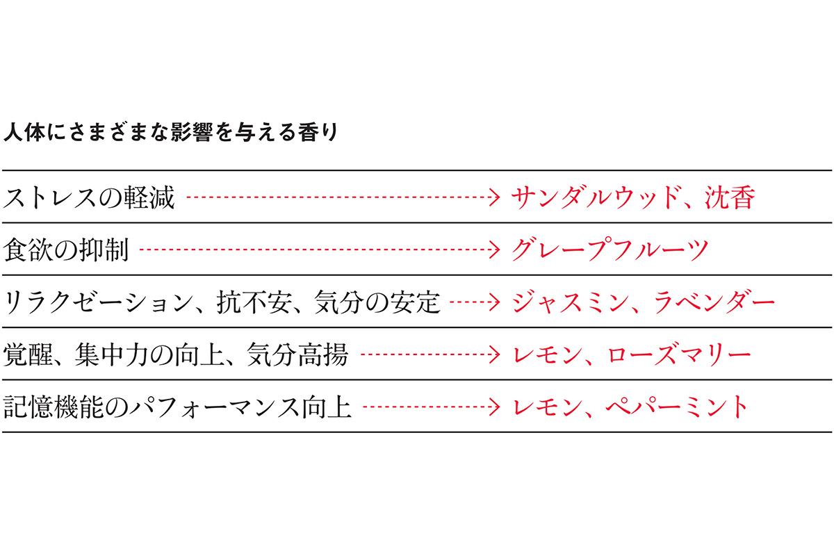 上田さんと日本香堂の共同研究で、レモンとサンダルウッドの香りが記憶機能に及ぼす作用が明らかになったように、香りが人の機能に与えるさまざまな影響がわかってきている。たとえばアロマオイルでは、サンダルウッドと沈香がストレス軽減に、ラベンダーが睡眠の質の向上に、ペパーミントが記憶機能のパフォーマンスの向上に効果があるという実験結果が報告されている。香り×脳の論文の中では、ローズマリーとレモンの覚醒・集中機能、ジャスミンとラベンダーのリラクゼーション機能についての研究が多い。