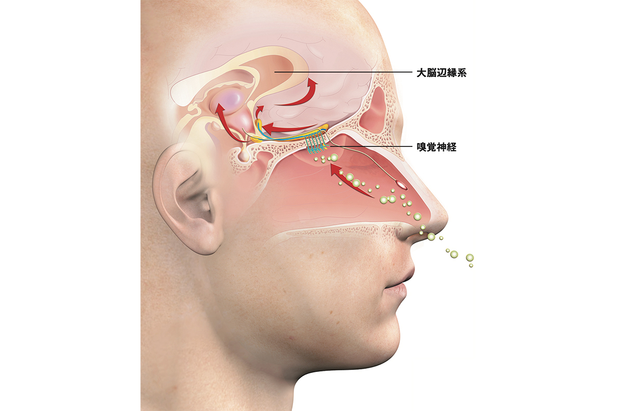 嗅覚神経と大脳辺縁系の近さがポイント。五感(受容器)が受け取った感覚情報は、視床を経由して大脳新皮質に伝達されるが、嗅覚情報は例外的に視床を介さず、大脳辺縁系に直接伝達される。大脳辺縁系は本能や感情など、生きていく上でより本質的な部分をつかさどる部位。記憶に関連する海馬や感情に関連する扁桃体という器官もあることから、香りは記憶や感情と結び付きやすいと考えられている。特定の香りによって、記憶や当時の感情を思い出すプルースト効果という現象もこれに関連する。