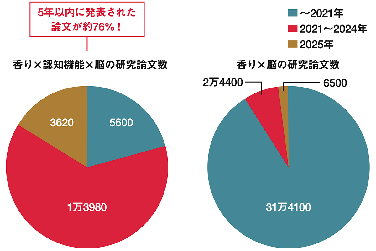 学術的な文献を検索できる「Google Scholar」によるとこれまで発表された香り×脳の研究論文は34万5000件。そのうち2025年は2月時点ですでに6500件が発表されている。香り×人の認知機能×脳の研究では言語機能・記憶機能の改善や脳の容積の増加、神経のつながりの強化が報告されるなど、香りと人の認知機能や脳との関係が解明されつつある。