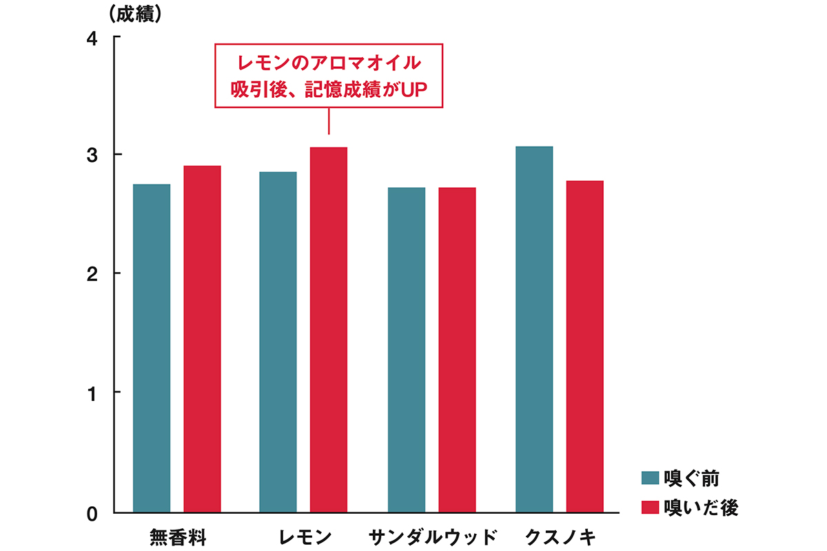 3種類の精油吸引前後に被験者が行った記憶機能(ワーキングメモリー)課題の成績を比較したところ、レモンの精油吸引後の成績が統計的に有意に向上していることがわかった