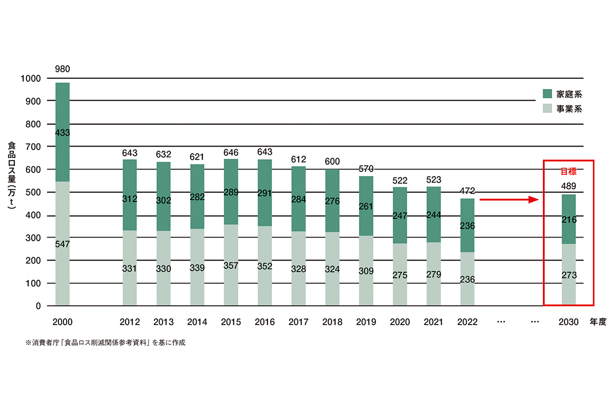 日本の年間食品ロス量は、2000年度の約980万tから2022年度には約472万tと減少した。ただしそれでも世界の年間食料援助量のほぼ同じ量に匹敵する量だ。ここ数年間で食品ロス発生量は減少しているものの、依然として家庭などからのロスが全体の約半分を占める。さらなる消費者の意識改革が求められているのだ