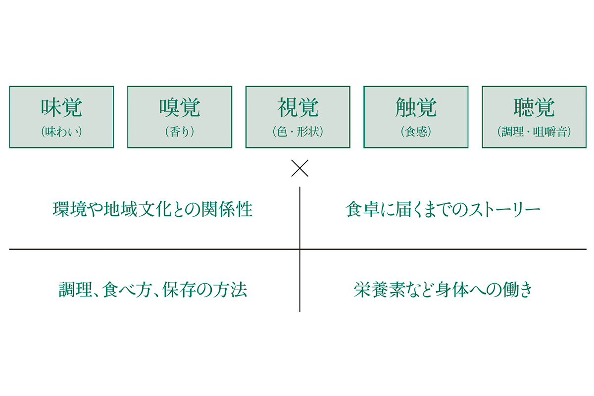 人間は五感と情報の掛け合わせで美味しさを味わっている。味覚、嗅覚、視覚、触覚、聴覚といった五感をフル稼働させることで、食材の風味や食味が存分に味わえる。同時に、料理に込められたつくり手の工夫や食材が育まれる環境のストーリーは、食事体験を豊かにするものだ。