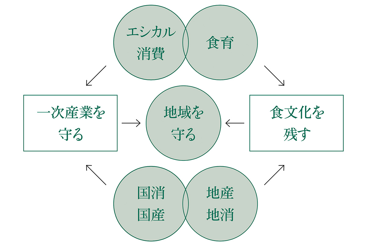 日本の食と農業の未来を守るには「食文化を残し」、「一次産業を守る」取り組みが必須。食の知識を深めながら、地産地消で地域の農業を支援し食文化を維持。生産者の労働に見合った適正価格で購入するエシカル消費も欠かせない。生産者は消費者のニーズに合う農畜産物をつくり、食べ手も国産の食品を消費することを意識して、国消国産に努めたい。