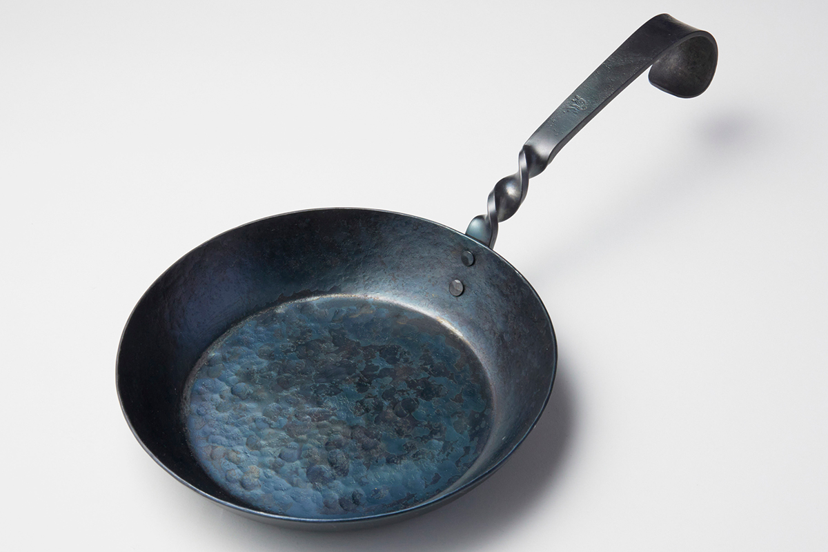 くるくるとひねりを加えた鍛造フライパン。金槌でたたき上げる槌目が利いていて、キャンプ映えする。millioの代表・安隨誠さんは、ブランド立ち上げ当初から、この鉄製のフライパンをつくり続ける。