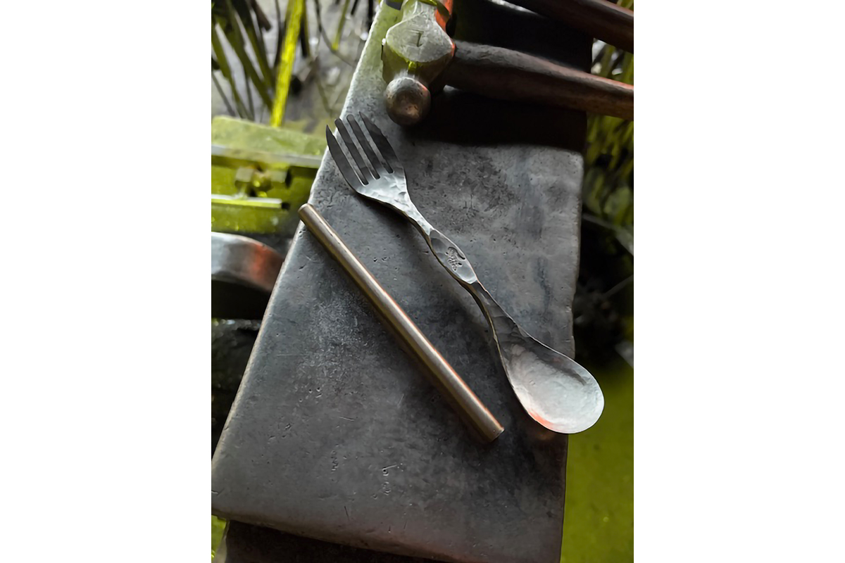 フォークスプーンは長さ13㎝×直径9㎜の丸棒を、19㎝になるまでひたすら金槌でたたき上げ、口触りよく仕上げていく