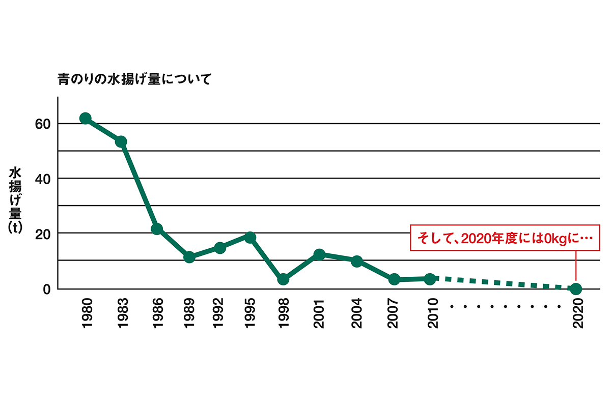 高知県四万十川など全国の産地で、1980年には乾燥重量で年間約60t水揚げされていたすじ青のりは、2020年より4年連続漁獲量がゼロの不漁に。