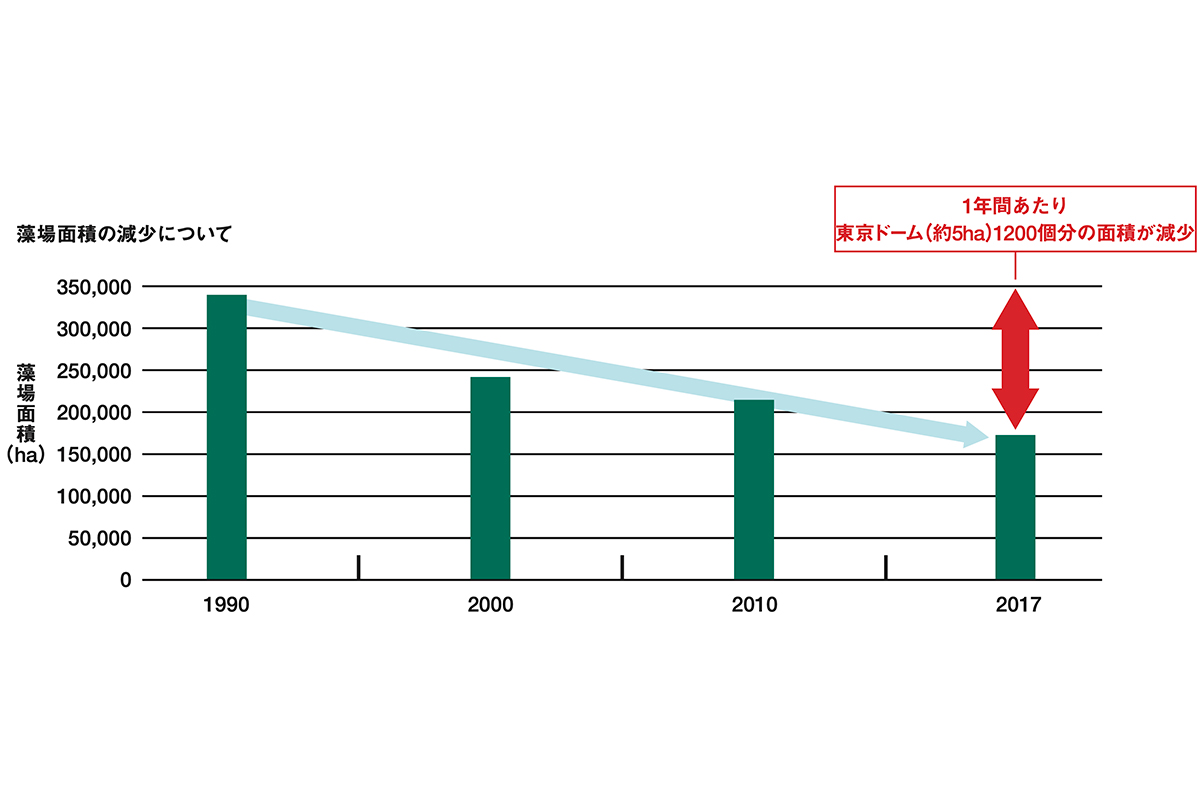 天然の藻場は、27年間で約16万ha減少した。1年で換算すると東京ドーム約1200個分の面積が減少する深刻な状況に陥っている。