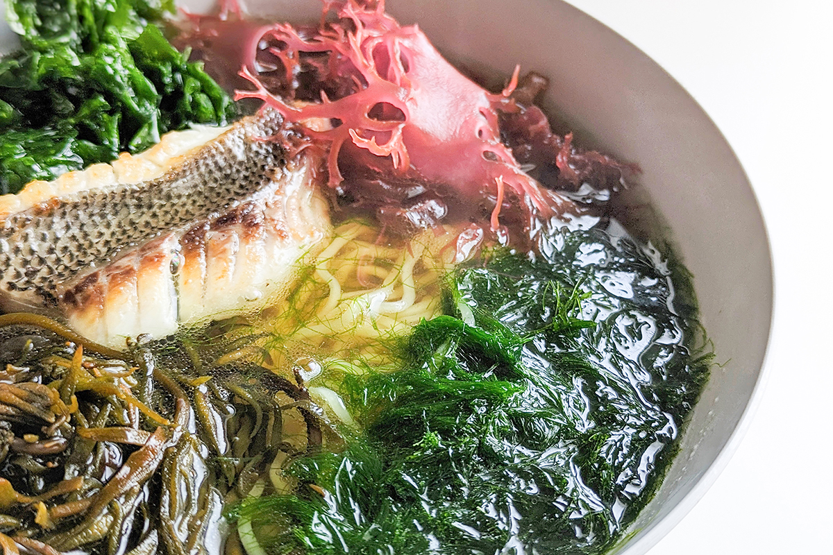 岡田さんはシーベジタブルの海藻を使用し、新しい海藻料理を発信する「藻場亭(もばてい)」の監修を行う。食感とスープの味が変化していく海藻ラーメンが話題