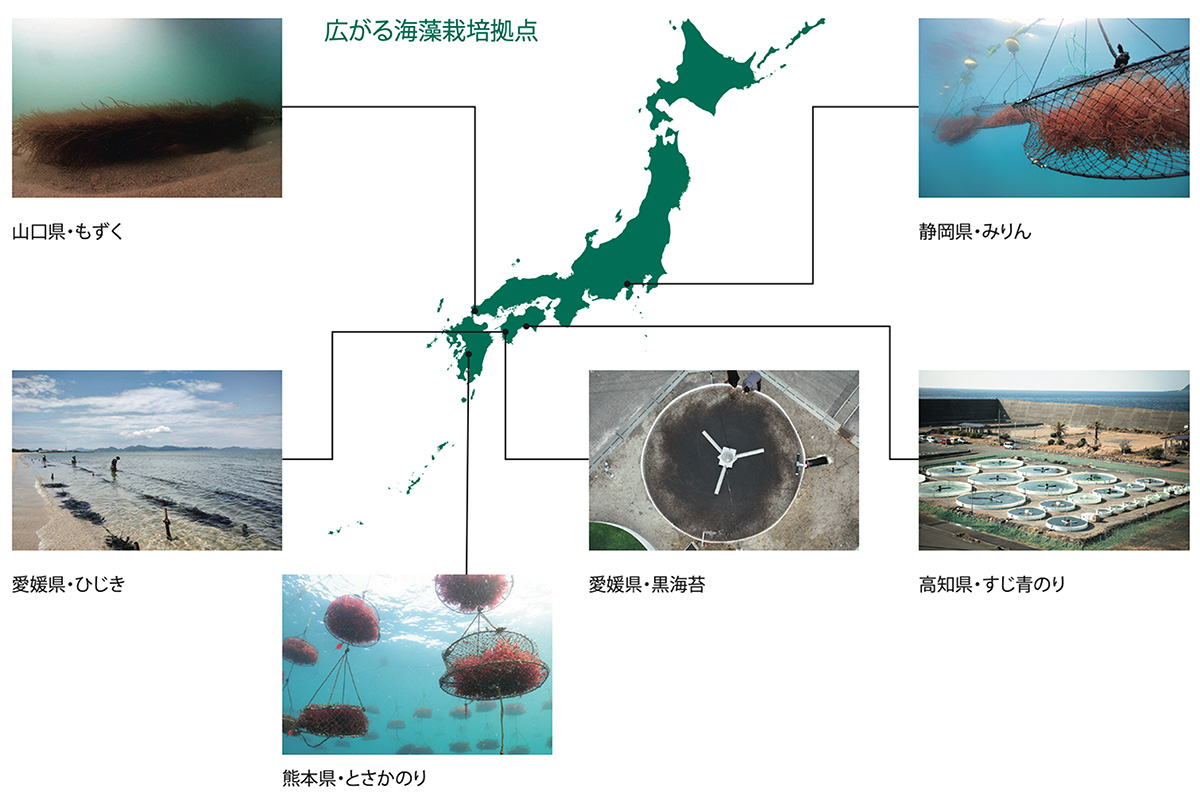 シーベジタブルは各地の漁業者と手を組み、多種類の海藻栽培を行う。すじ青のりの地下海水を利用した陸上栽培にはじまり、黒海苔(学名:スサビノリ)の量産技術の確立など、そのすべてが世界初の快挙。30種類以上の海藻の種苗生産技術を確立し、海面栽培においては海の生態系を守りながら、漁師たちの生業も生んでいる。