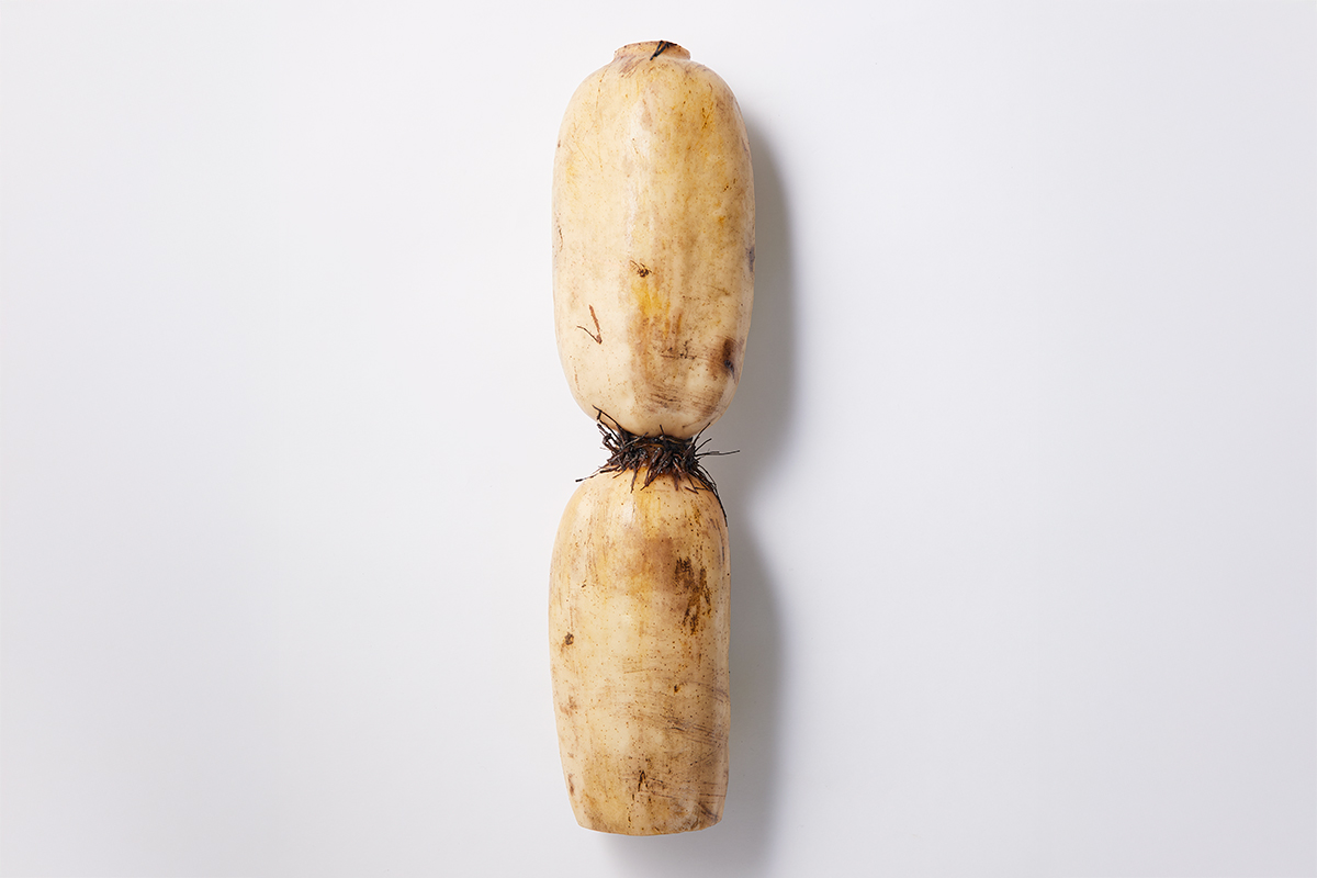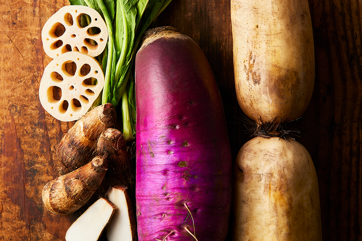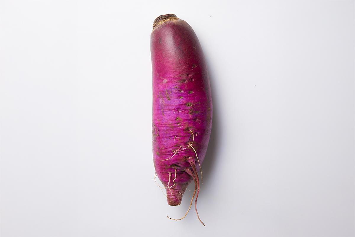 雲仙市で約40年にわたり古来種の種採り農家を続けるパイオニア・岩崎さんが栽培。外は濃い赤紫だが中は真っ白で身質は緻密。色を生かすならピクルスやサラダで。煮物にして豊かな甘みときめ細かい食感を楽しむのも◎