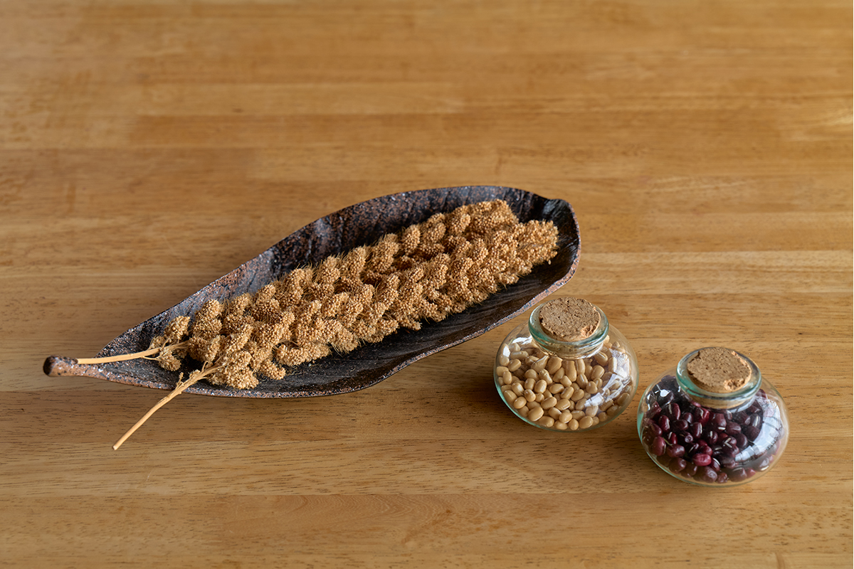 軟らかさと風味が特徴の宇陀大納言小豆、上品な風味が特徴の大和白小豆。在来種の粟「むこだまし」は強い粘りをもつ。