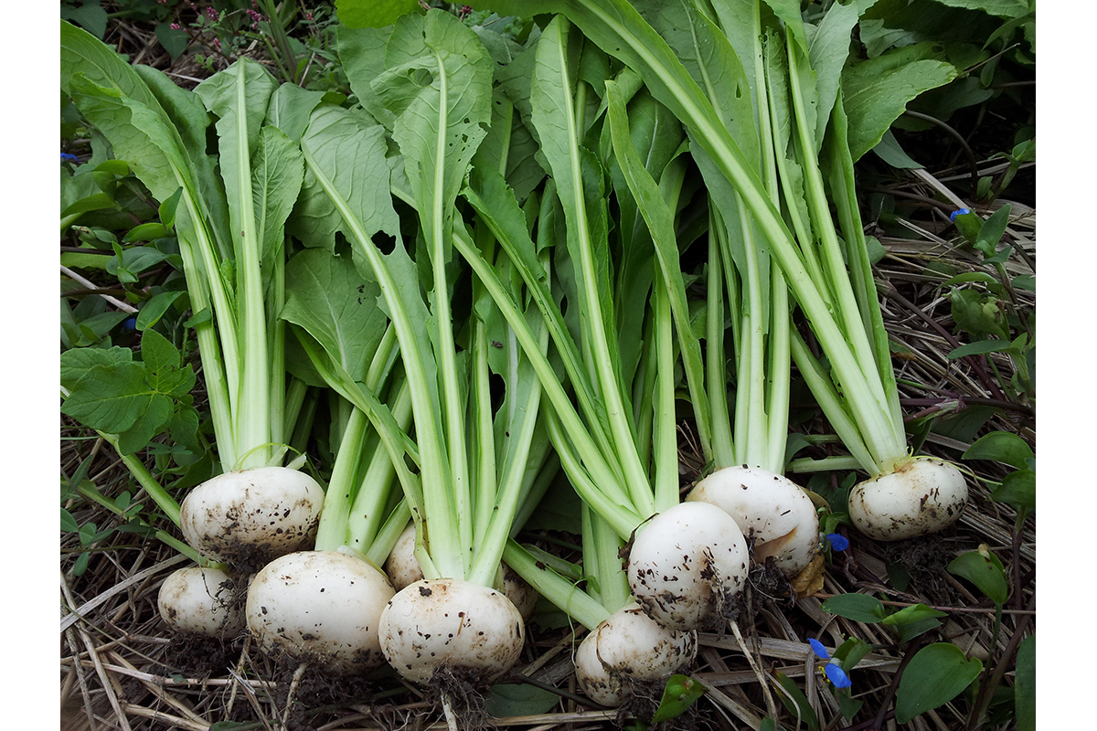 代表的な大和伝統野菜のひとつ。軟らかさと独特な甘みが特徴。漬物やおひたし、油揚げと炊き込む郷土食「炊いたん」などで食されている。