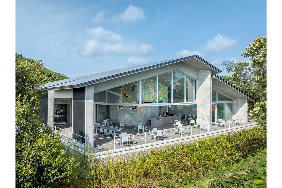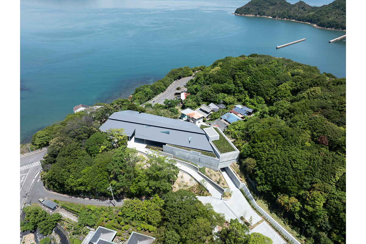 丘の稜線をゆるやかにつなぐような⼤きな屋根に地下2階、地上1階建ての特徴的な建物。地上から地下まで⾃然光が⼊る階段室やそこから両側に広がる4つのギャラリー、瀬戸内海を望むことができるカフェを併設。そのため、豊島や⾏き交う漁船など瀬⼾内海らしい穏やかな景観や自然を体感できる。