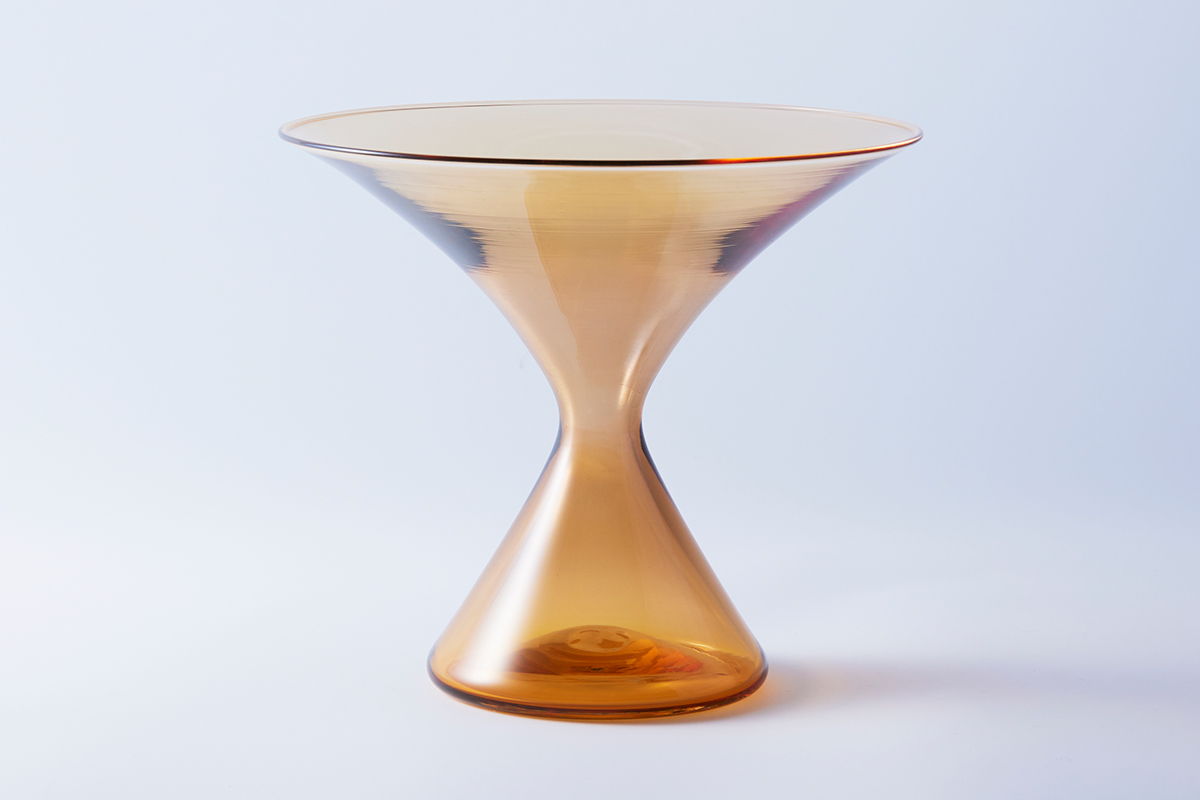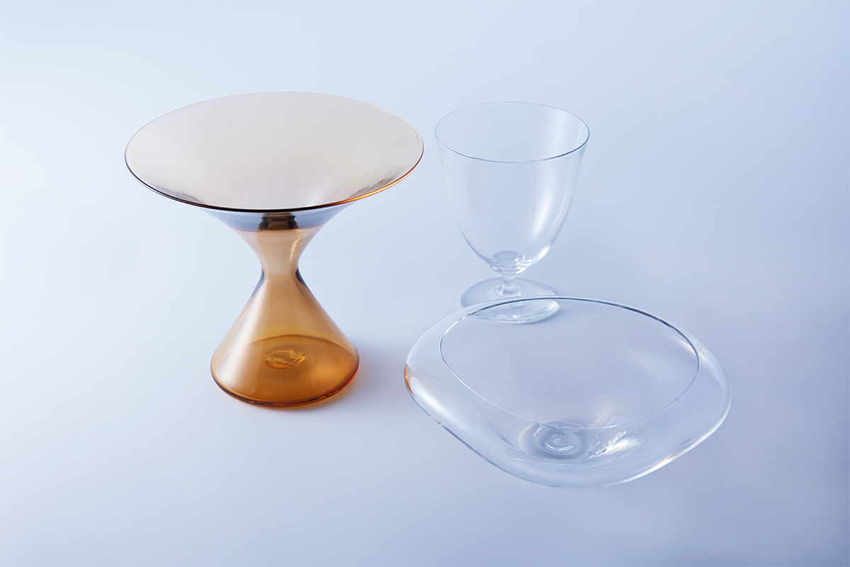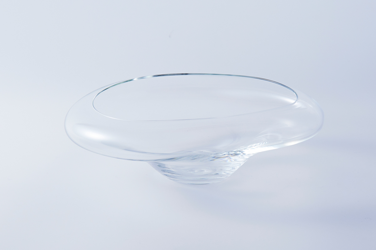 高温で溶けたガラスが見せる自然な表情と手仕事による造形を掛け合わせることで生まれる古賀さんの作品には、柔らかさとスマートさが共存する。温度差を利用して表情を操作する“ゆらぎ”こそ古賀さんの持ち味であり、そこに直線を融合させることで、ありそうでなかったかたちを見事に表現する。