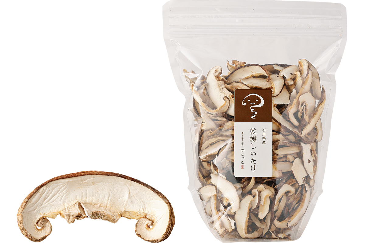 「椎茸品評会」で最優秀賞を受賞した肉厚のシイタケは、老舗の名店でも使われるほど。乾燥スライスの本品は、のとっこの味がいつでも手軽に楽しめる。「自宅にストックして、そのまま料理にポンっと入れています。香りも味も濃いので、戻し汁の出汁ごといただきます」