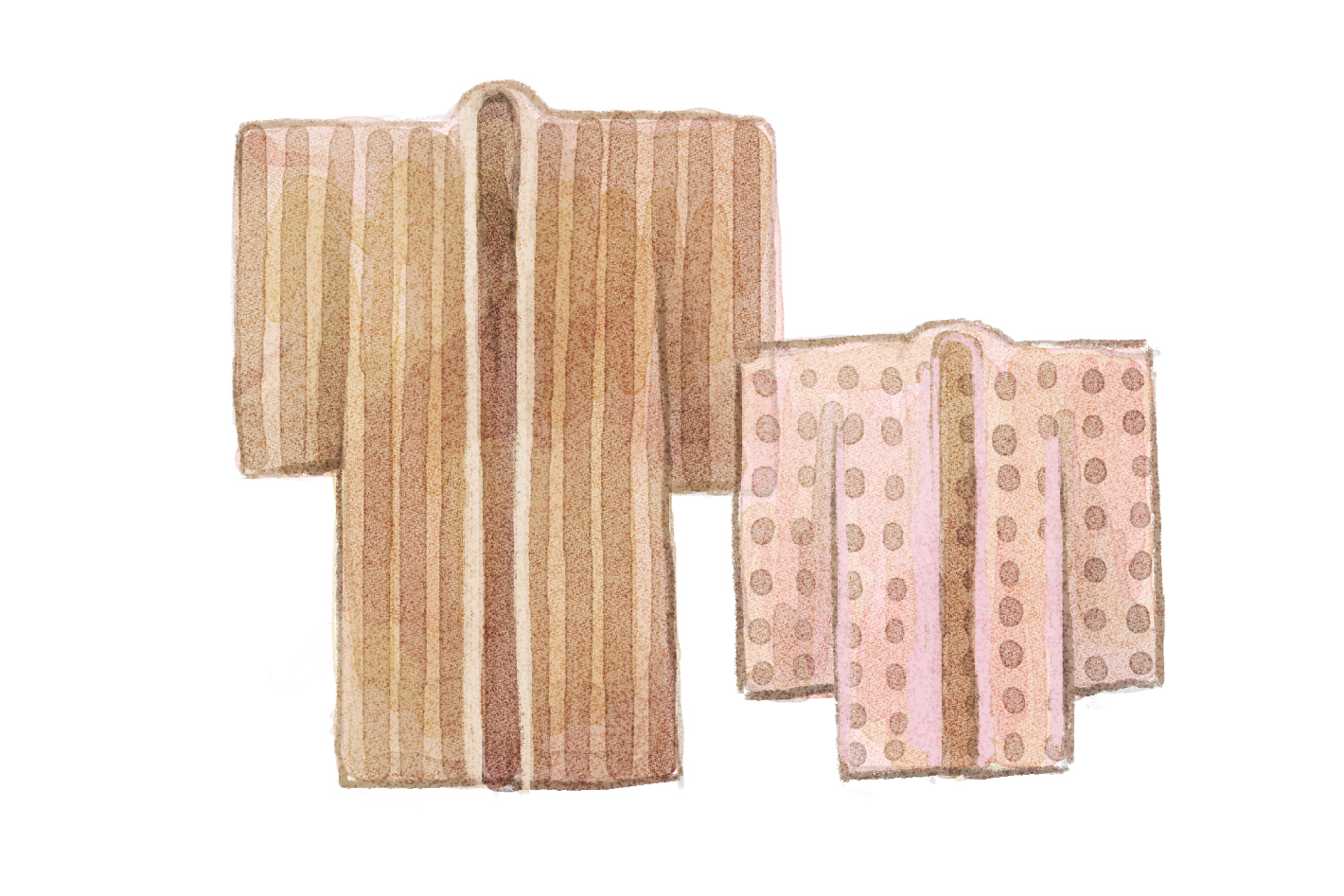 上方の古着は、綿花が育たない北陸や東北で人気だった商品のひとつ。日本海沿岸地域には、古着を糸状に裂いて緯糸にし、新たな布に再生する「裂織」や、着物をほどいた木綿生地を重ねて木綿糸で縫い合わせる「刺し子」などの技法が残る。