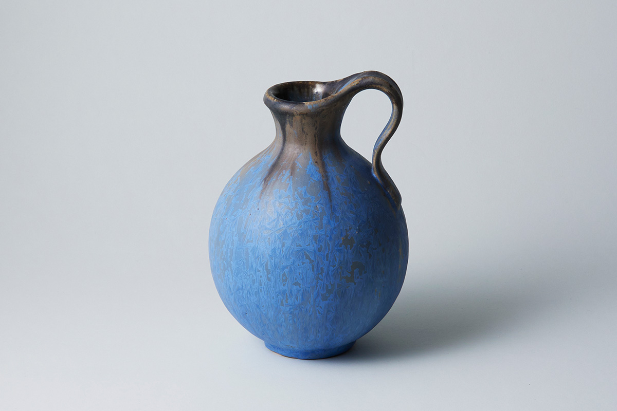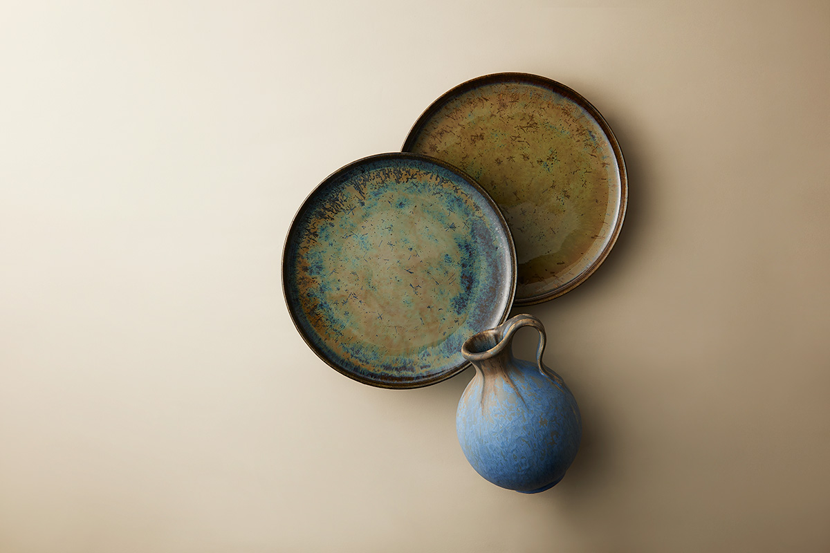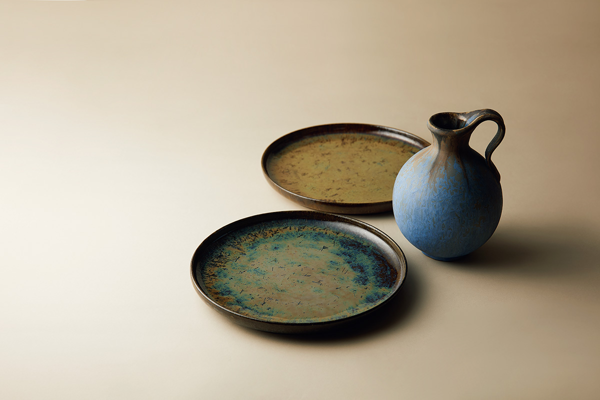 焼成時に生まれる、天体のようにキラキラとした結晶や、広がりを感じるまだら模様。内村さんの持ち味である結晶釉による意匠は一見すると直感的に見えるが、実際は意図した変化が窯の中で起こるよう、釉薬のかけ具合などを綿密に計算している。「陶芸はエモーショナルな部分もあれば、緻密に計算した数字に左右される部分もあって。真逆のことが共存するバランス感覚がおもしろいと感じています」と、どちらに比重を置くのかは作家次第。それこそが作風をかたちづくっているのだ。