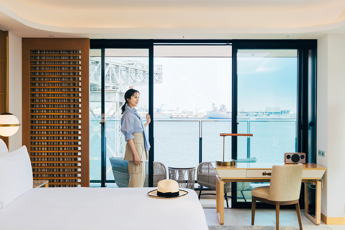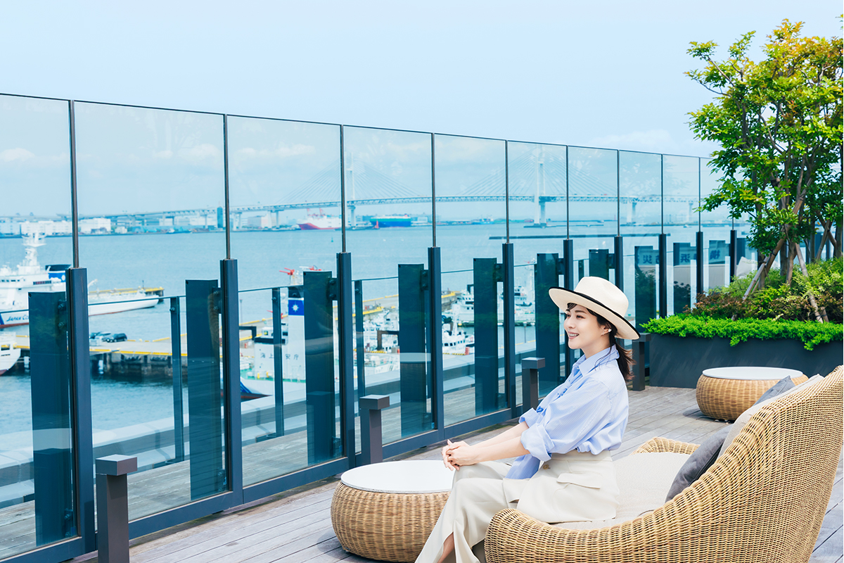 インターコンチネンタル横浜Pier 8のスイートルームからテラスへ出れば、横浜みなとみらいの海が一望できる。出航する船の汽笛が響き、眼下のふ頭にはクルーズ船が停泊していることも。優雅な船出気分が味わえて、心浮き立つ滞在ができる