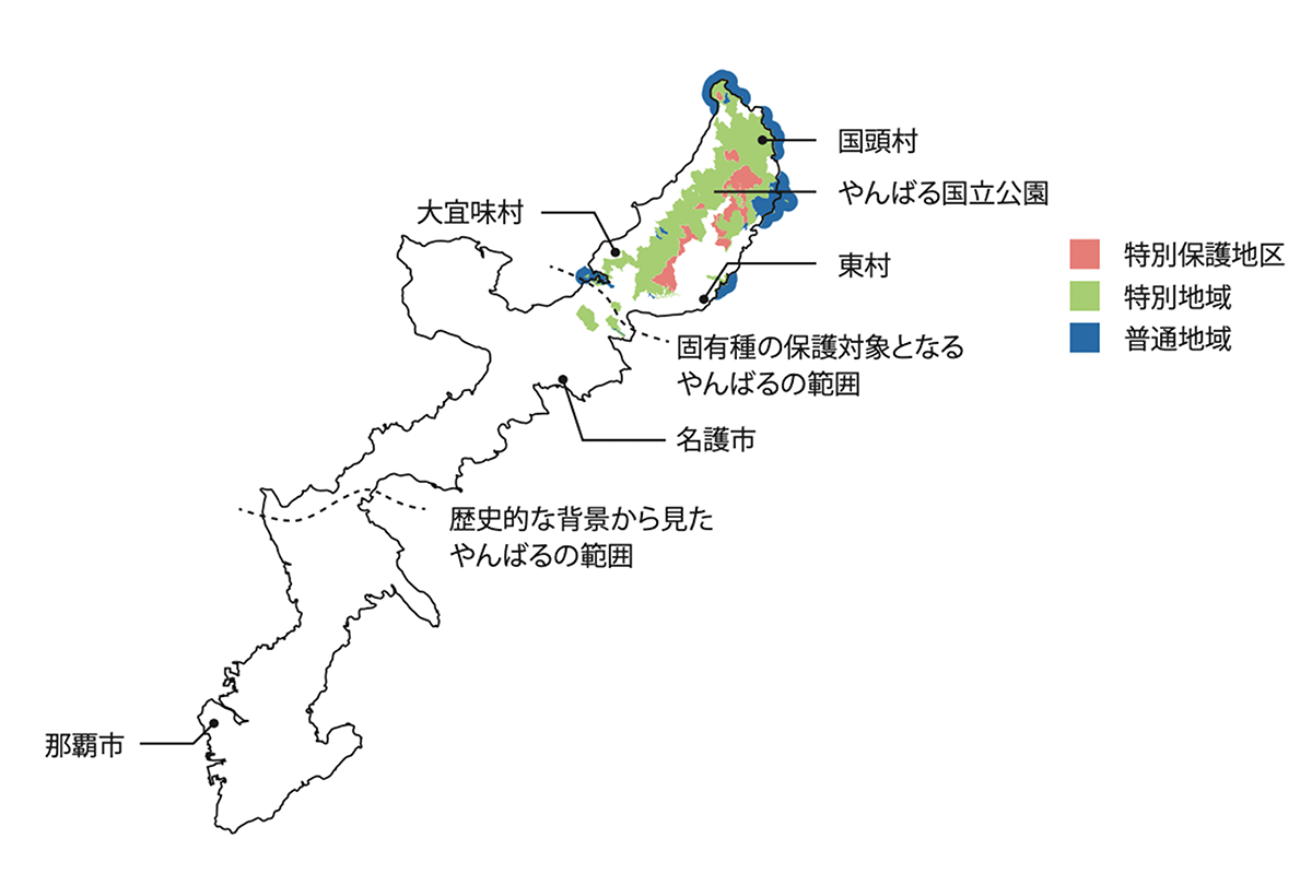 「やんばる」は広く沖縄本島北部を示す言葉。明確な範囲は決まっていないが、一般的には名護市以北のエリアを指すことが多い。最北部の3村・国頭くにがみ村、大宜味おおぎみ村、東村(やんばる3村)には、亜熱帯照葉樹林が広がっており、一部は国立公園に指定、そして世界自然遺産にも登録されている。