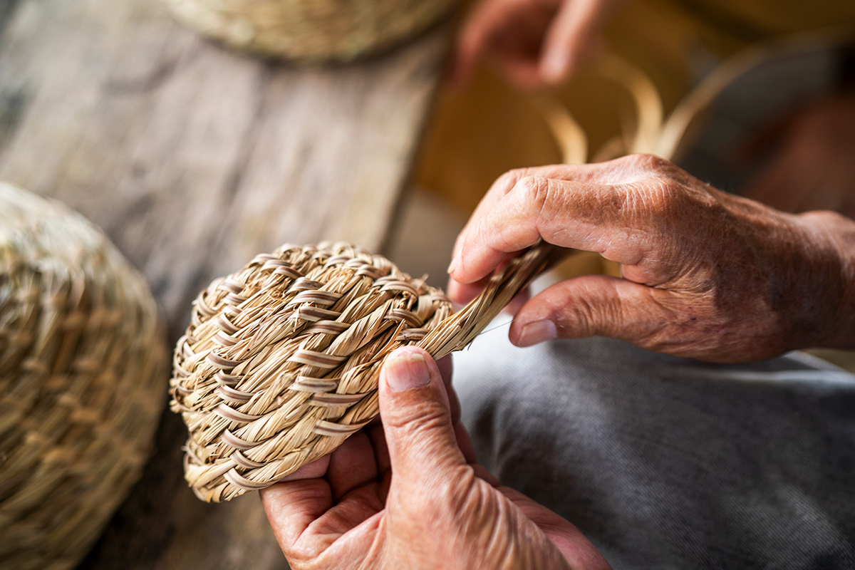 そして自然素材を生かした、伝統的な手仕事も。たとえば、バショウ科の植物である糸芭蕉の繊維を糸にしてつくる織物・芭蕉布ばしょうふや、月桃や竹などを使った籠や箒といった暮らしの道具づくりはいまも受け継がれる。