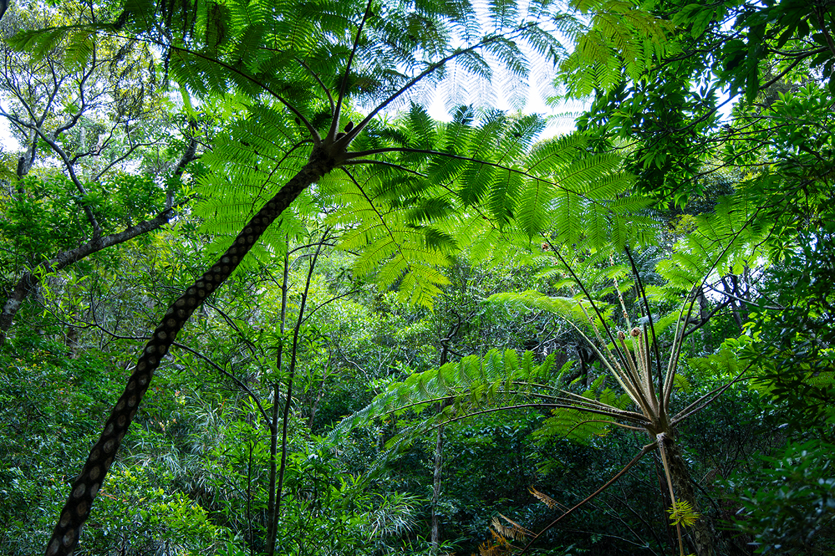 「国頭村森林公園」の光景。黒潮や台風などの影響で雨量が多く、温暖な気候となるため豊かな森が形成される。亜熱帯地域に森林があるのは世界的にも珍しい。スダジイなどのブナ科植物やヒカゲヘゴなどで構成される極相林が広がる