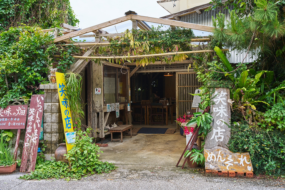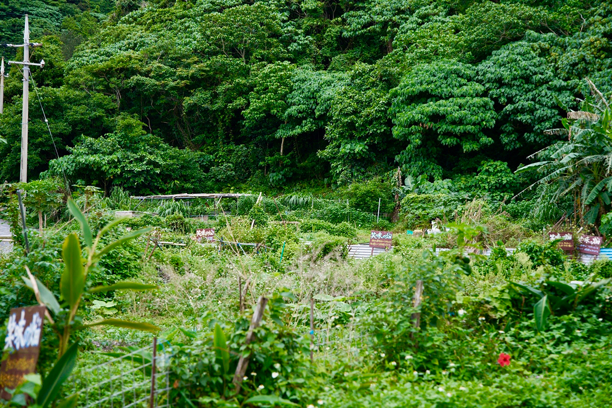 店の前にある笑味の畑では、さまざまな島野菜が力強く育っている。笑子さんはこぼれ種からも苗を育て、人に分けてもいるという。「去年、うちの畑ではニガナがうまくいかなかったのだけれど、環境が違う畑ではよく育つこともあるし、興味がある人に苗をわけて育ててもらっているの。在来種を残すためにも広めていきたいし。好きなものを植えて収穫するのは、本当に楽しいこと」