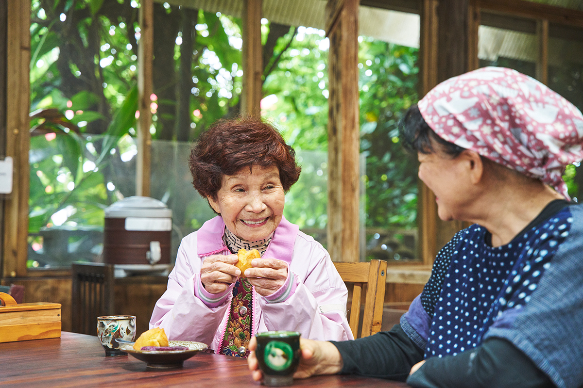 「健康で長生きしようと思ったらね、3食しっかり食べること。出来合いのものは買わないで、季節の野菜や豆腐を使って、自分でつくるよ。あと気の持ち方ね。必ず外に行って誰かと会って、おしゃべりしてるさー」