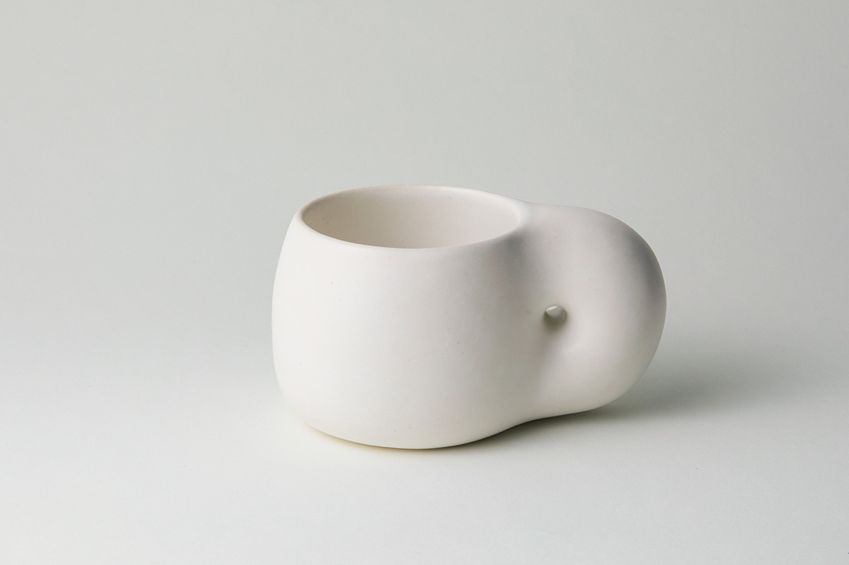 子どもが大人用のマグカップを持つときのつかみにくい感覚を、大人にも味わってもらおうと制作した一品。ドーナツのようなまん丸フォルムもかわいらしい。