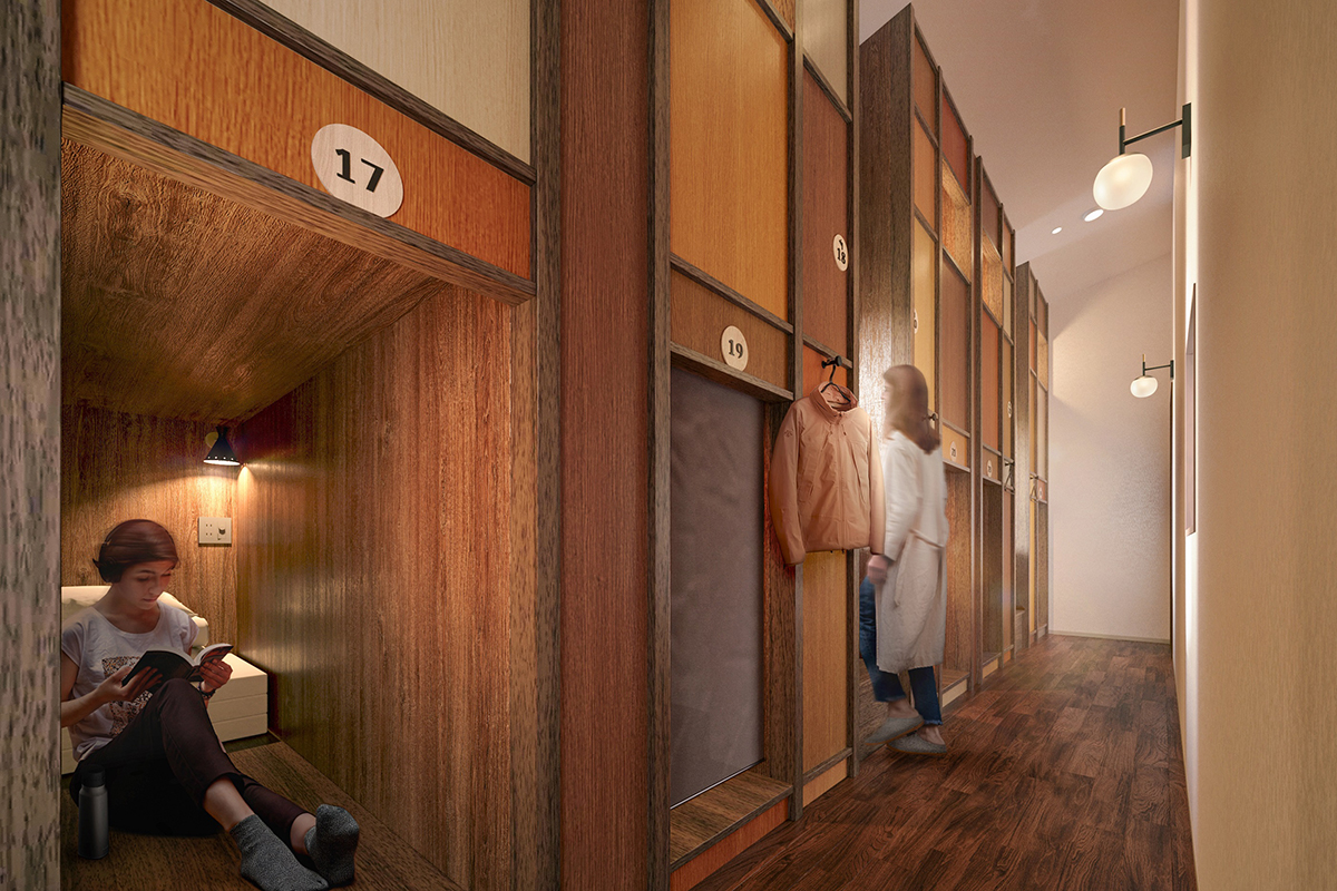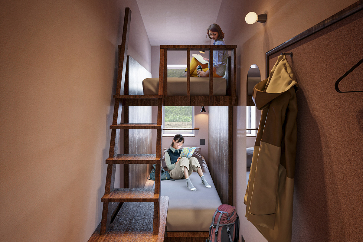 全25室の客室は、最大4名まで利用できる客室のほか、プライバシーを担保するドミトリータイプの一人部屋も用意。夕食のメインメニューとして、身も心も温まる「LUCY豚汁」を提供するほか、山への出発前のラストコンビニとして、24時間利用することができる「Food & Drink Station」も設置する。さらには、日帰りでの利用も可能な「はとまちベースCafe & shop」も隣接して出店。自然はもちろん、食も楽しめる施設の開業が待ち遠しい。