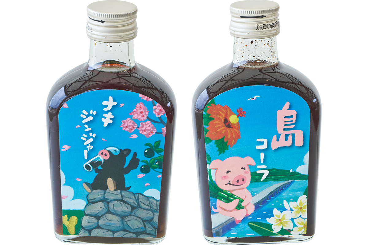 8種のスパイスやピールで仕上げたクラフトコーラは、ミルクで割ればチャイに。今帰仁村のショウガを搾ったナキジンジャーは、シークヮーサー果汁入りでスパイシー。世界遺産・今帰仁城跡の石垣と、古宇利大橋が描かれた瓶もかわいい(ともに1480円)。