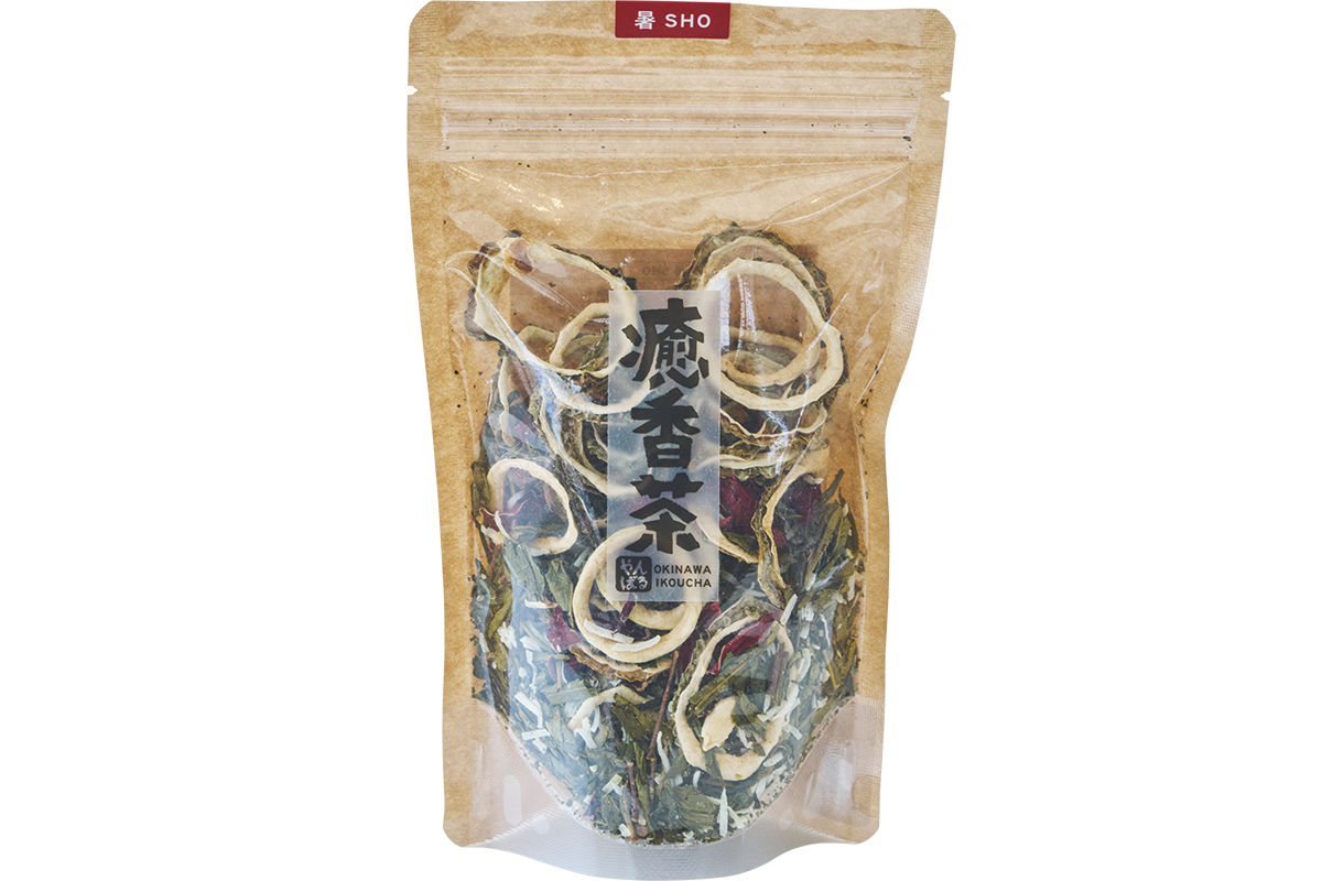 薬膳の概念に基づいて沖縄の植物をブレンドする癒香茶シリーズ。「暑 SHO」(1620円)は、有機緑茶、ゴーヤー、ココナッツ、ハイビスカスを使ったデトックスブレンド。湯を注ぐと、緑のゴーヤと、赤い花びらがふわり。