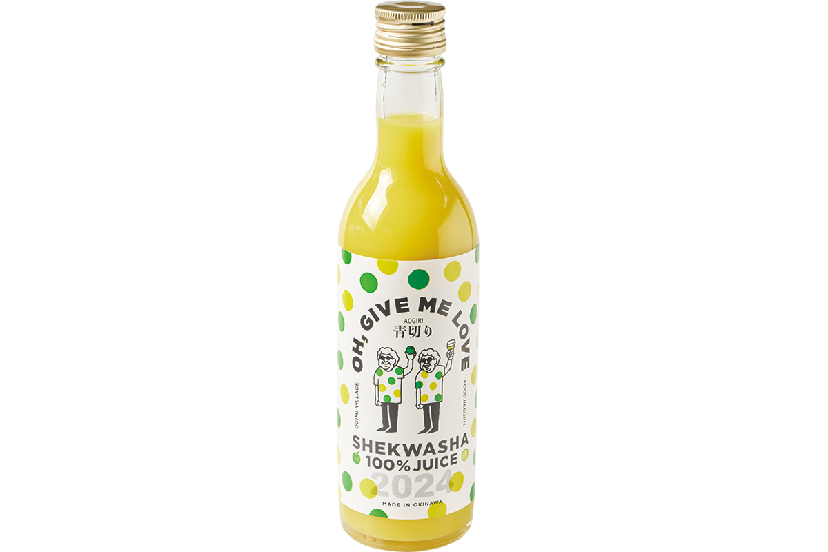 大宜味村特産のシークヮーサーを、青い皮ごと搾った、ほろ苦さが特徴。炭酸で割ったり、酒に入れたり、焼き魚にかけても。OH, GIVE ME LOVE(オーギミラブ)のキャラクター「おばぁ」もキュート(1300円)。