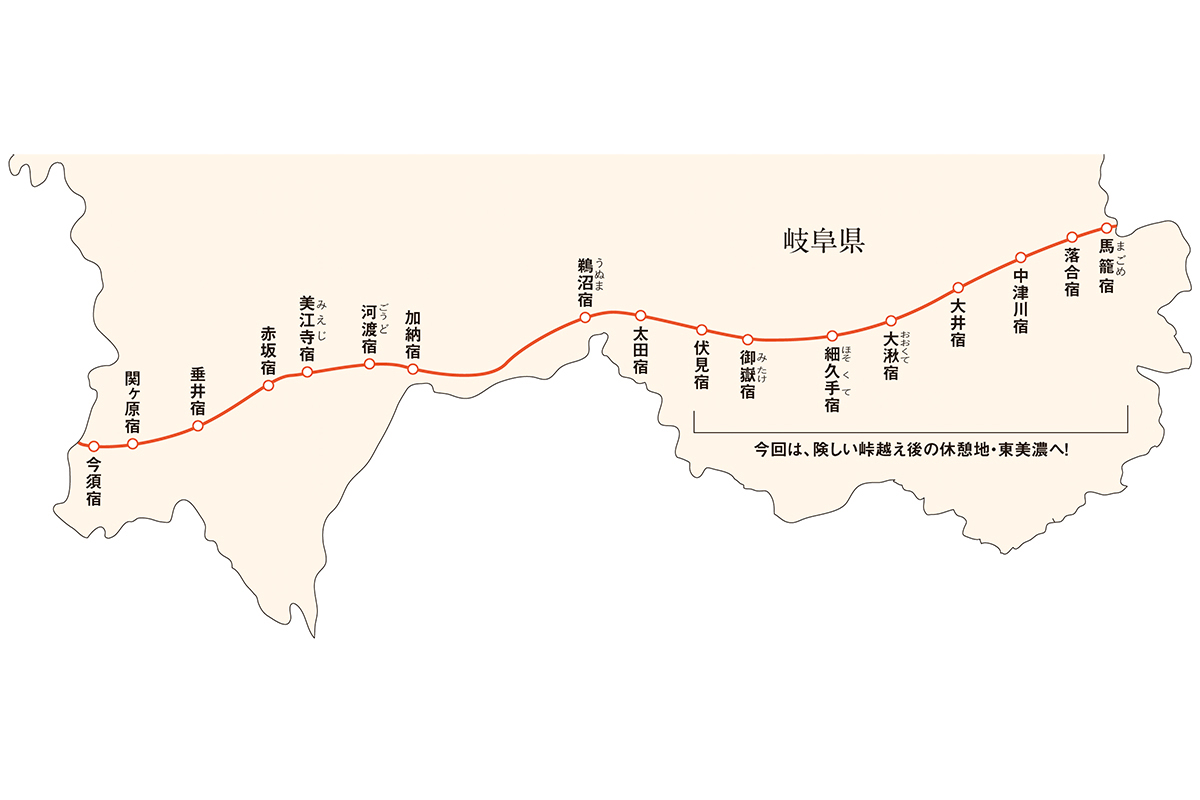 「中山道六十九次」において、43番目の馬籠宿から59番目の今須宿まで17の宿場町が横断する岐阜県内。今回は戦火を免れたために貴重な資料が残る中津川宿など、東美濃を中心にめぐった。