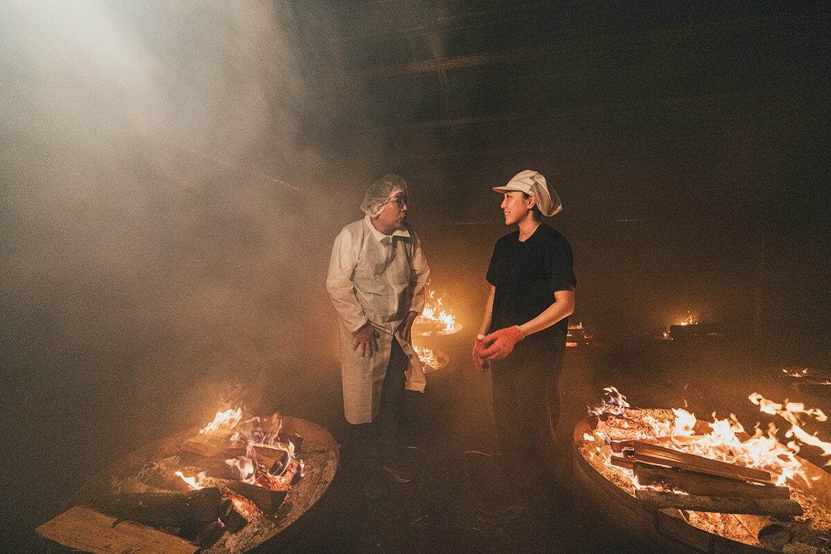 鰹節の香りや品質を大きく左右するのが、焙乾と呼ばれる燻しの工程である。「㈱柳屋本店」では、熱と煙が立ち込める昔ながらの「急造庫」での焙乾がメインで行われており、そこに若い職人の姿があった。