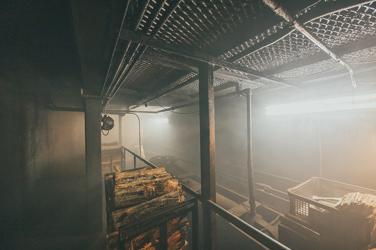 ㈱柳屋本店が創業以来続けているのが、建物の地下になる最下層で大量の薪を焚き、自然対流で立ち上る熱や煙を鰹にまとわせる急造庫での焙乾だ。薪を組み、火を入れるのが12時ぐらい。途中で2回ほど火床に薪を足し、5〜6時間薪を燃やし続ける。煮鰹が並ぶせいろは、徐々に上に移していく。それを毎日繰り返すこと数十日。煮鰹の水分が抜けていき、5分の1の重さになるという。