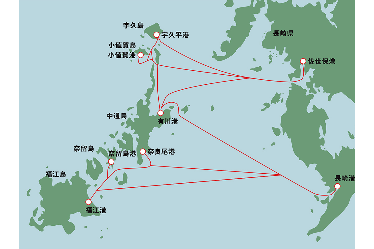 所要時間|佐世保~宇久平2時間25分、佐世保~小値賀2時間35分、佐世保~有川2時間35分、長崎~有川1時間43分、長崎~福江1時間25分(ぺがさす/ぺがさす2)/3時間10分(椿/万葉)