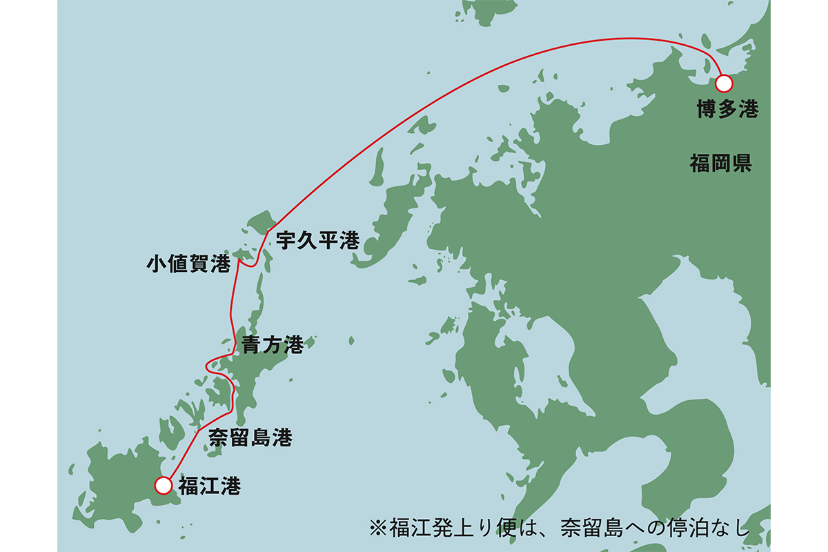 所要時間|8時間(博多~宇久平4時間10分、宇久平~小値賀35分、小値賀~青方50分、青方~奈留島1時間20分、奈留島~福江40分) ※博多発下り便