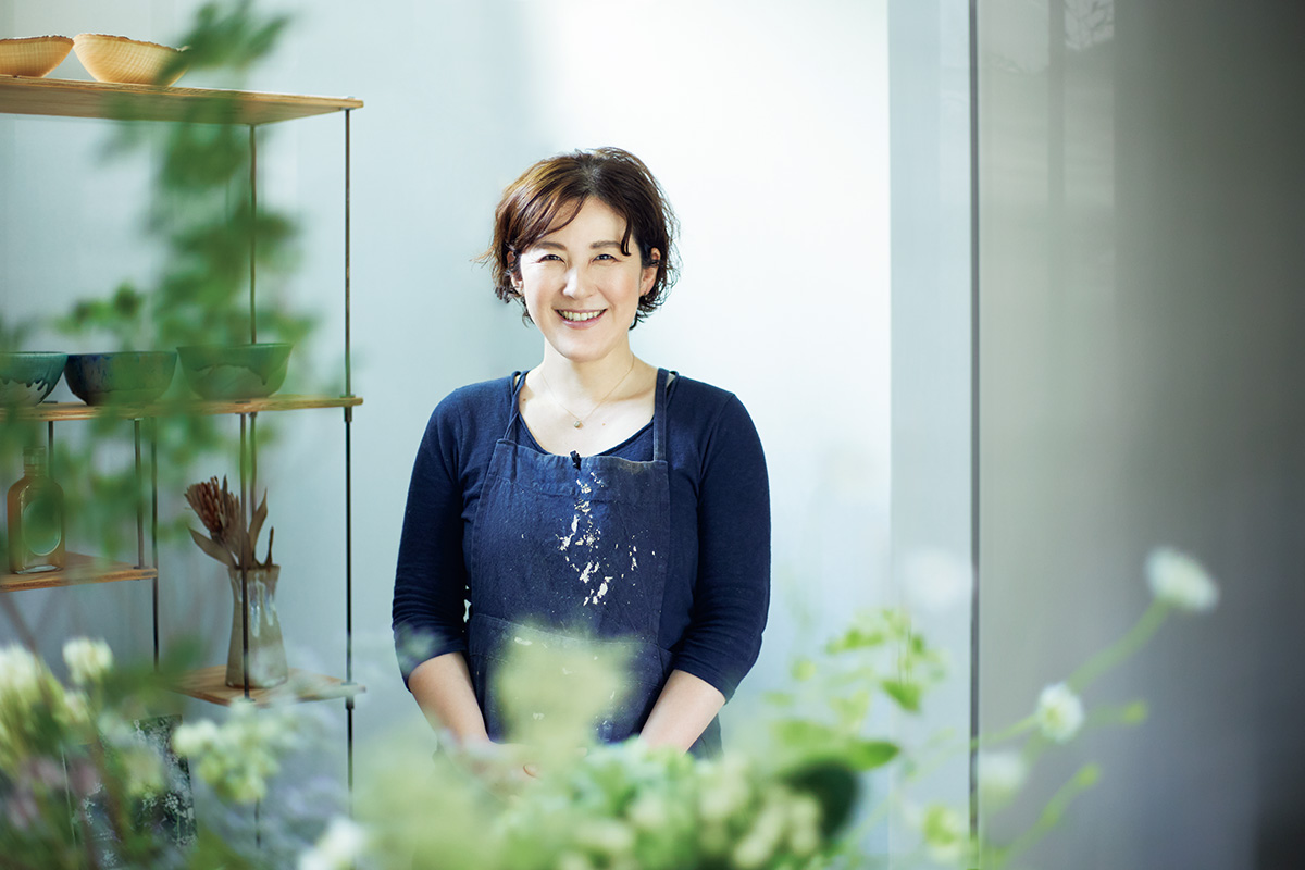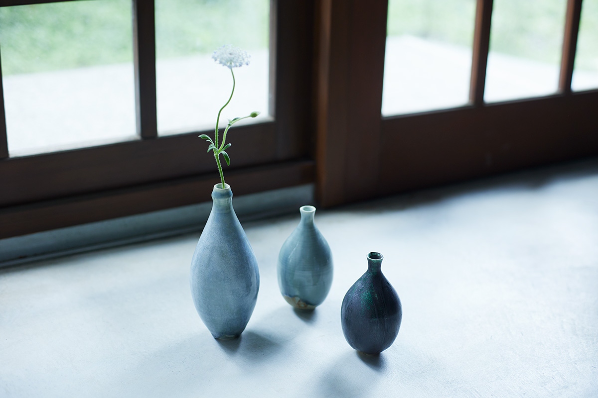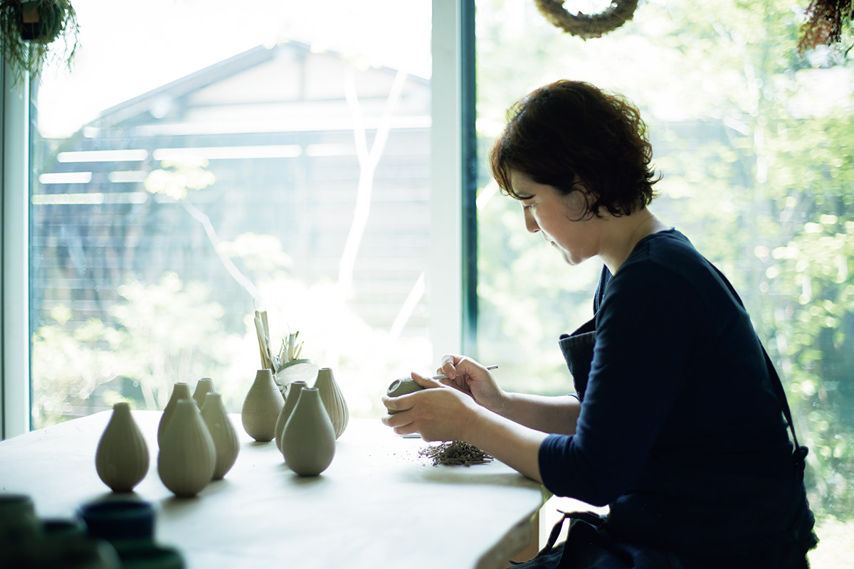 1年半前に開設したアトリエは、心地よく仕事ができるよう日々調整を続けている。作業場から見える庭では植物が揺れ、時折野鳥もやってくる。「植物と暮らす楽しさをあらためて感じたことも、個展のテーマにつながっているところで。今年は紫陽花がたくさんの花をつけてくれたのですが、切り花とはひと味違うさまに感動しましたね」。そう話す小川さんは、陶芸の道や、ゆとりある暮らしといった憧れを手繰り寄せ、日常の中にそっと落とし込んでいる。